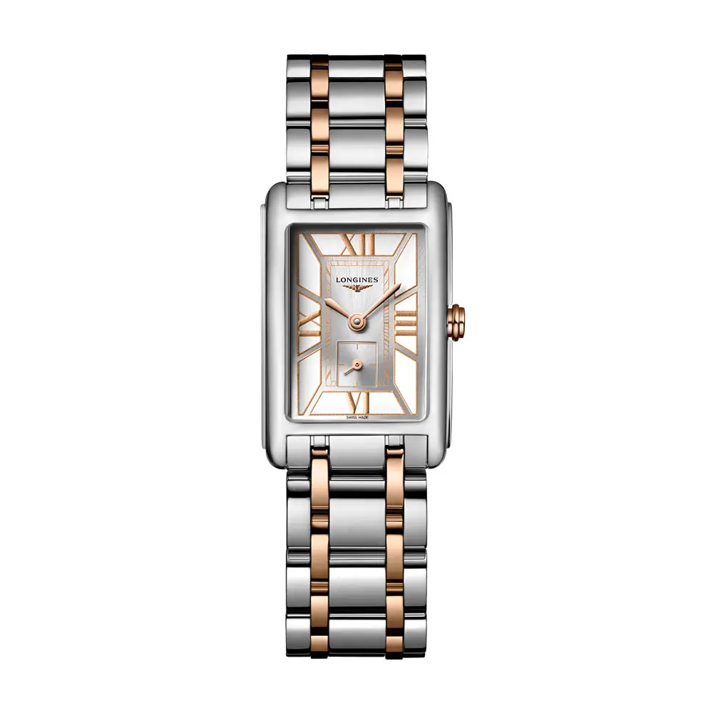 Longines 浪琴 DolceVita L5.255.5.75.7 是一款小巧的女士腕表,将 DolceVita 系列的优雅与精致的双色设计相结合。20.80 × 32.00 毫米精钢表壳 搭配 18K 玫瑰金表冠,银色 “flinqué” 表盘饰以罗马数字与蓝钢指针,展现经典气质。