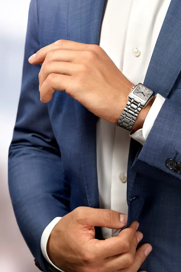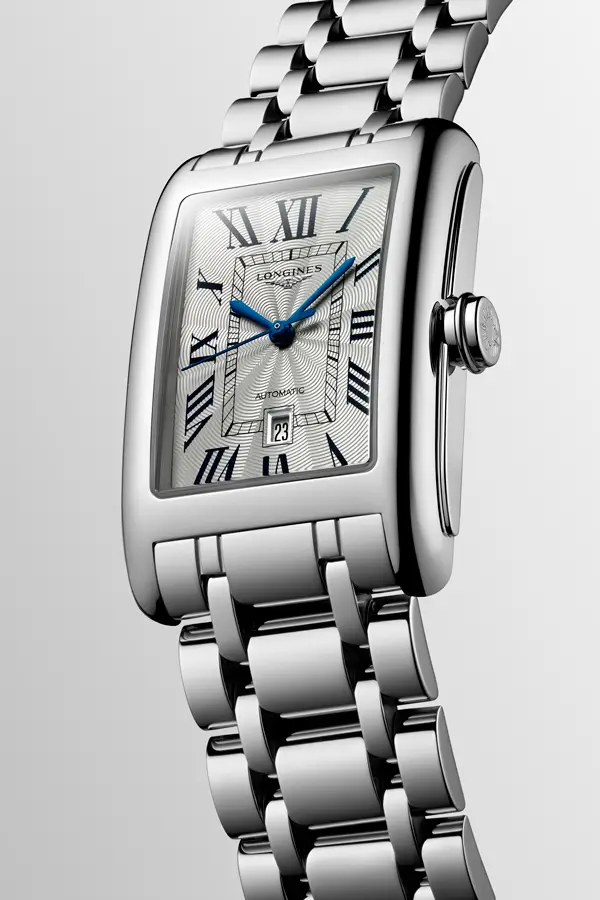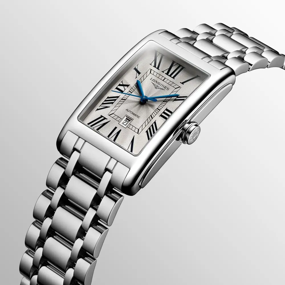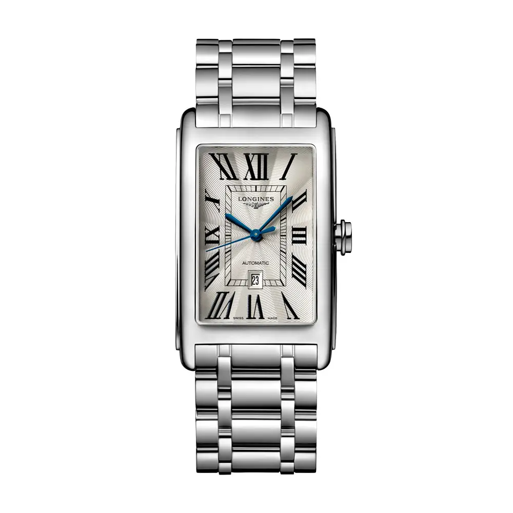 Longines 浪琴 DolceVita L5.767.4.71.6 是一款男士腕表,将经典矩形设计与现代机械机芯相结合。28.20 × 47.00 毫米精钢表壳 搭配银色 “flinqué” 表盘、罗马数字与蓝钢指针,展现 DolceVita 系列的永恒美感。
