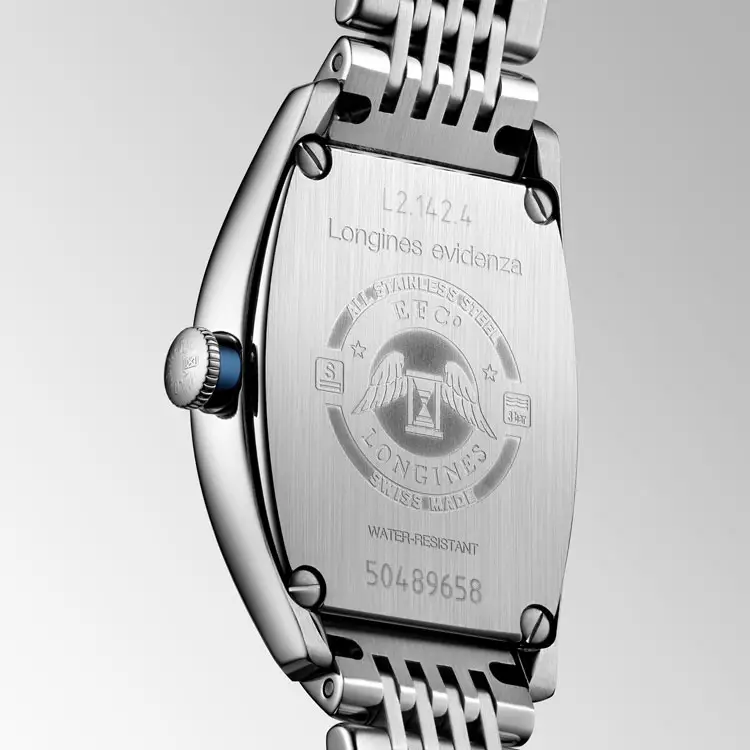 Longines Evidenza L2.142.4.60.6 融合了优雅与 1920 年代风格的复古魅力。其标志性的 酒桶形(tonneau)设计 以优美的曲线与精细的细节吸引目光。银色不锈钢表链配折叠扣 与整体外观完美匹配,确保佩戴舒适与安全。