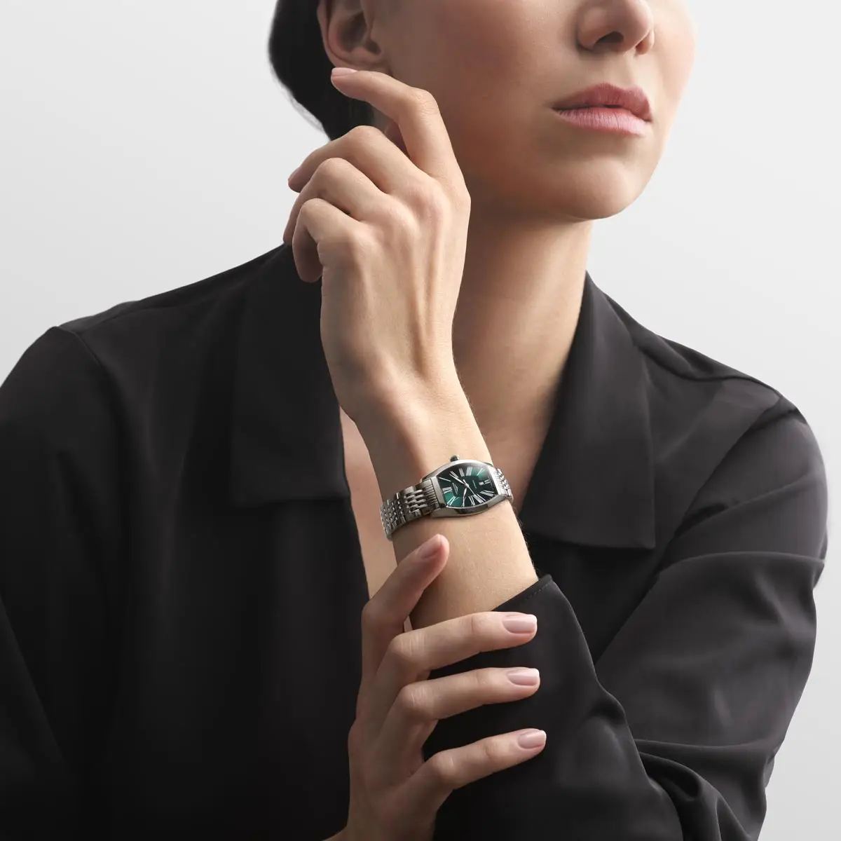 精致的 绿色模拟表盘 赋予腕表独特个性,并配有实用的 日期显示。整个表盘由 耐用的蓝宝石水晶玻璃 保护,保证长久使用和出色的可读性。