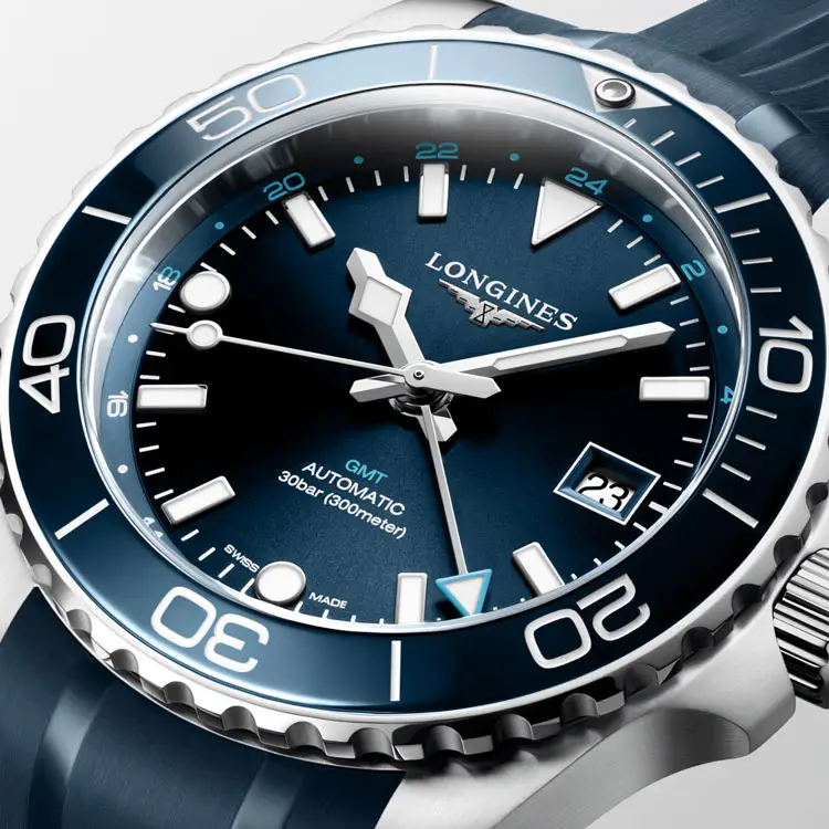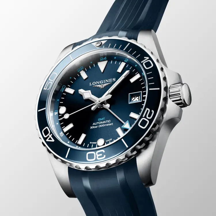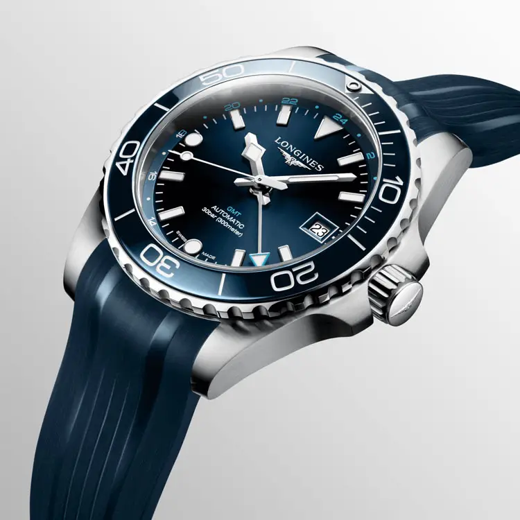 凭借 30 ATM(300 米)防水性能,该腕表完全适用于潜水及水上运动。蓝色橡胶表带 配备 折叠扣,佩戴舒适又安全。Longines HydroConquest GMT L3.790.4.96.9 是追求 强大性能与优雅外观结合 的男士的理想之选。