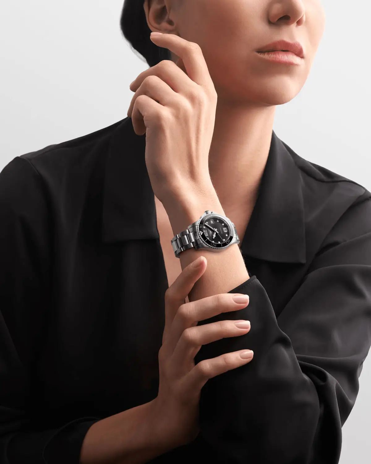 此款腕表具备30 ATM(300 米)防水性能,非常适合潜水使用。银色精钢表带搭配折叠扣,佩戴舒适且稳固。精致小巧的 Longines HydroConquest 是女性寻找兼具奢华运动风格与高度可靠性的理想选择。