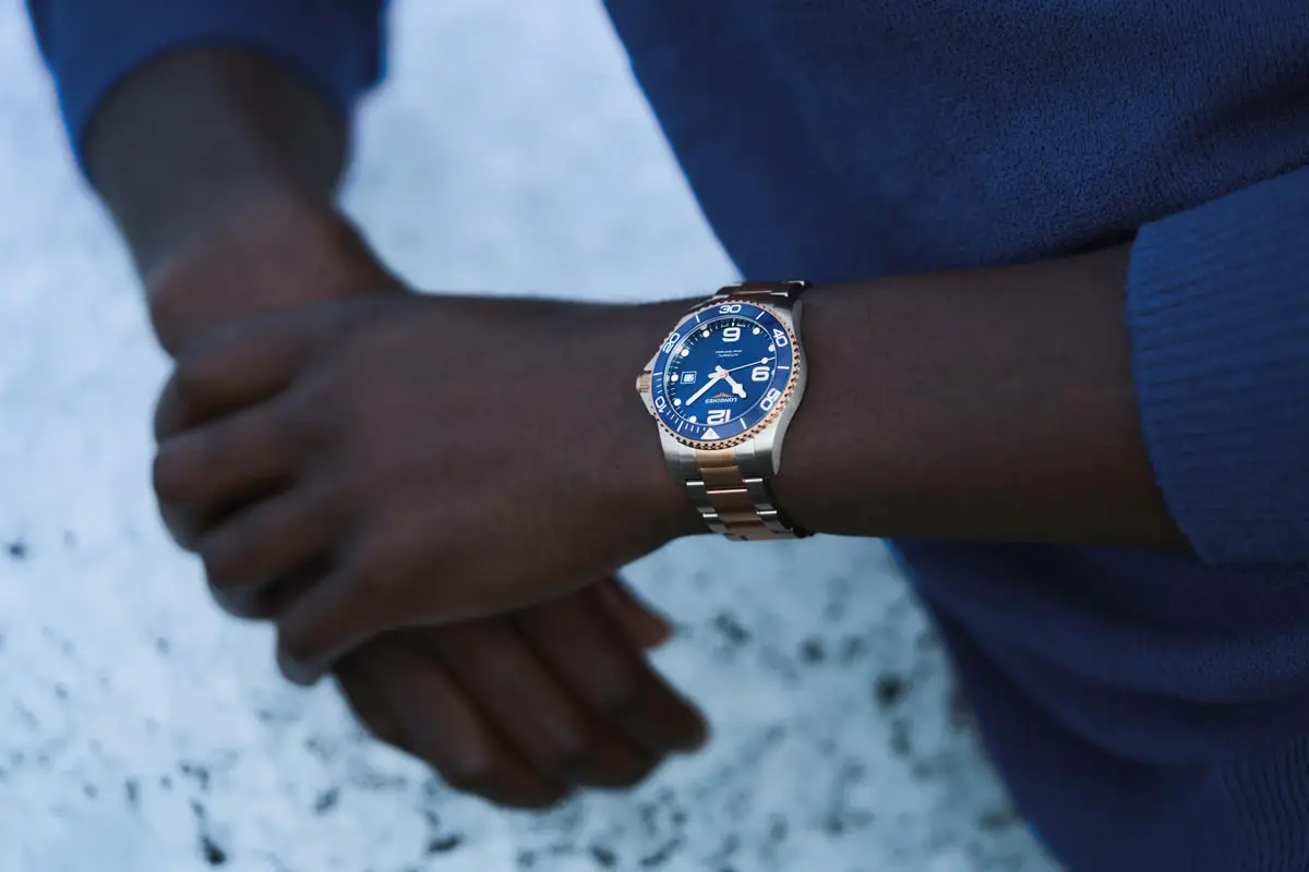 双色不锈钢表带配折叠式表扣 提供佩戴的舒适性与安全性。此款 HydroConquest 是追求 风格与耐用性兼备 的男士的不二之选。