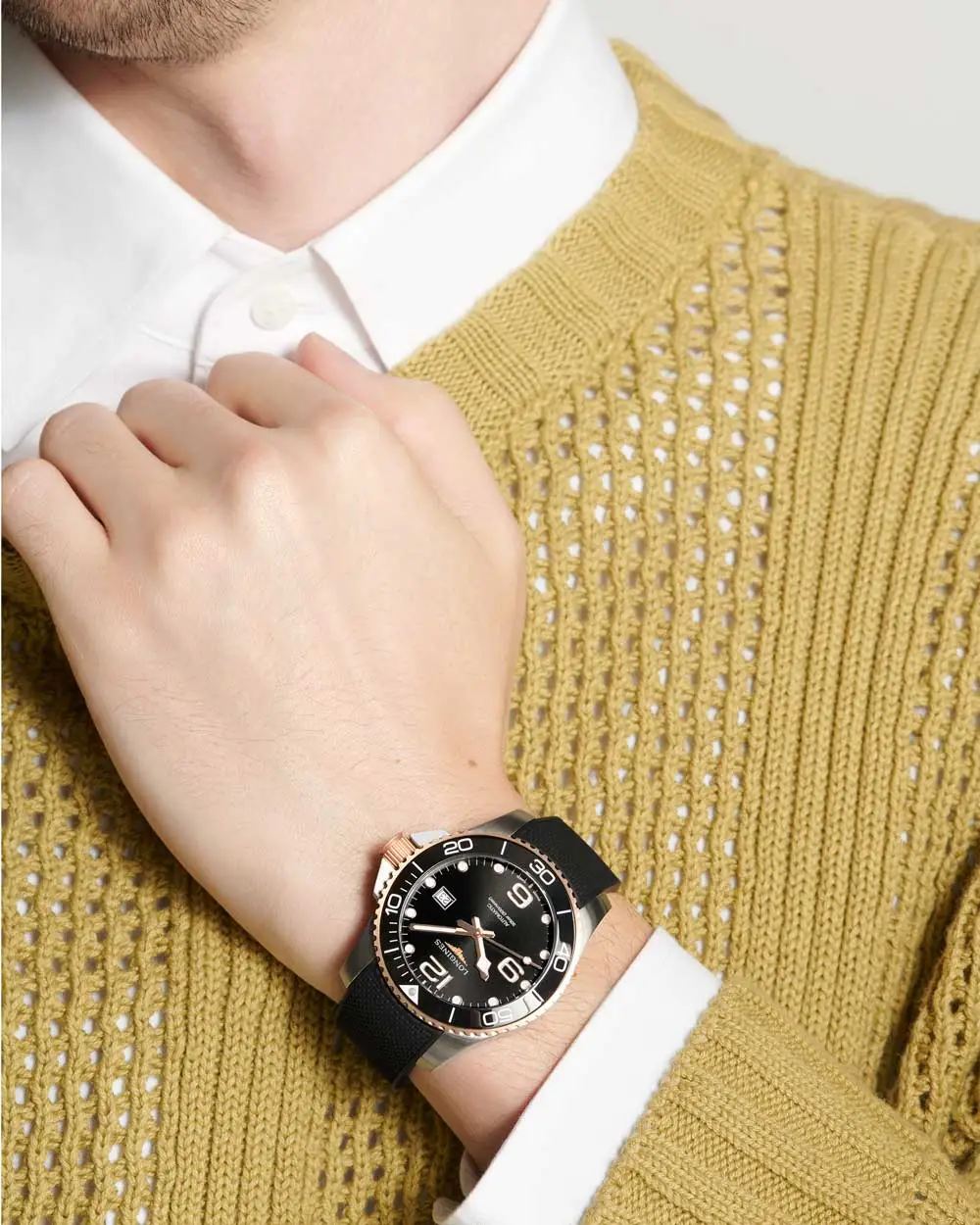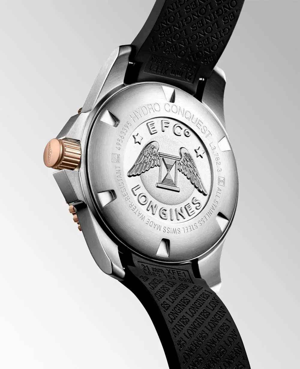 Longines HydroConquest L3.782.3.58.9 是一款高性能的运动腕表,融合了 坚固耐用性、精致设计 与 瑞士制表精准性。直径 43 毫米的圆形表壳 采用 不锈钢与玫瑰金色涂层组合,与 黑色陶瓷表盘 形成醒目的对比。表盘由 带防反光涂层的蓝宝石水晶玻璃 保护,并配有 实用的日期显示。