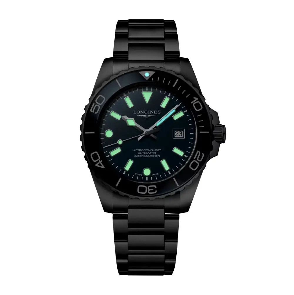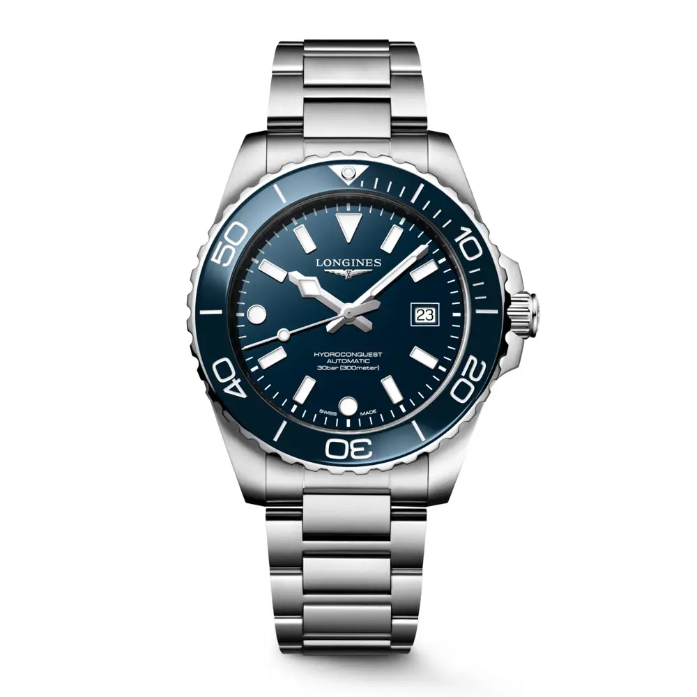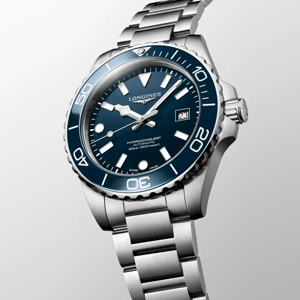 HydroConquest 系列采用坚固的不锈钢、陶瓷或钛金属表壳,防水深度达 300 米,单向旋转月轮可确保水下安全计时。蓝色、黑色、灰色或绿色的表盘与夜光指针和刻度相得益彰,即使在深海中也清晰可辨。