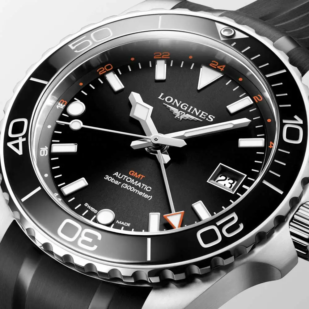 浪琴 HydroConquest GMT L3.790.4.56.9 融合了 GMT 双时区功能与运动坚固风格。其 41 毫米精钢表壳 配备 陶瓷表圈 与防反射蓝宝石镜面。拥有 30 巴(300 米)防水性能,旋入式表冠与单向表圈,确保出色表现。