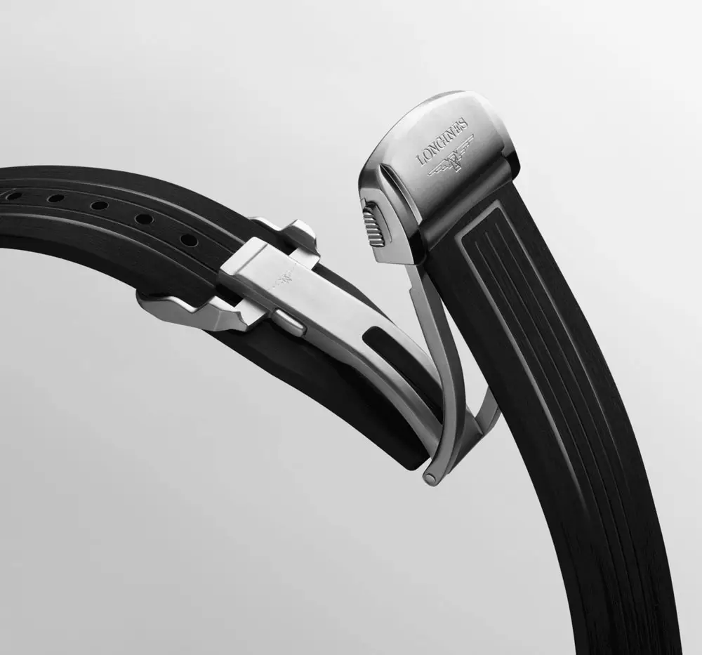腕表内部搭载 自动机芯 L844 GMT,具备 72 小时动力储存,振频 25,200 次/小时。配备 黑色橡胶表带与双重安全折叠扣(带微调功能),佩戴舒适稳固。HydroConquest GMT L3.790.4.56.9 体现 性能、可靠性与瑞士制表精湛工艺。