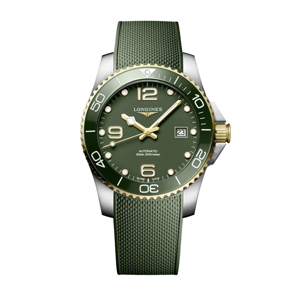 具备 30 ATM(300 米)防水性能,适合深潜及日常使用。绿色橡胶表带配折叠扣,舒适耐用。浪琴 HydroConquest L3.781.3.06.9 是融合强劲性能、运动优雅与瑞士品质的理想之选。