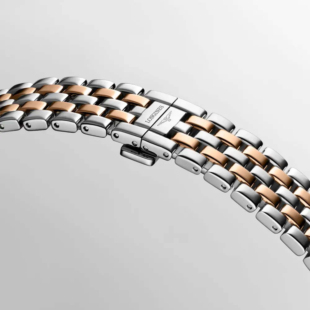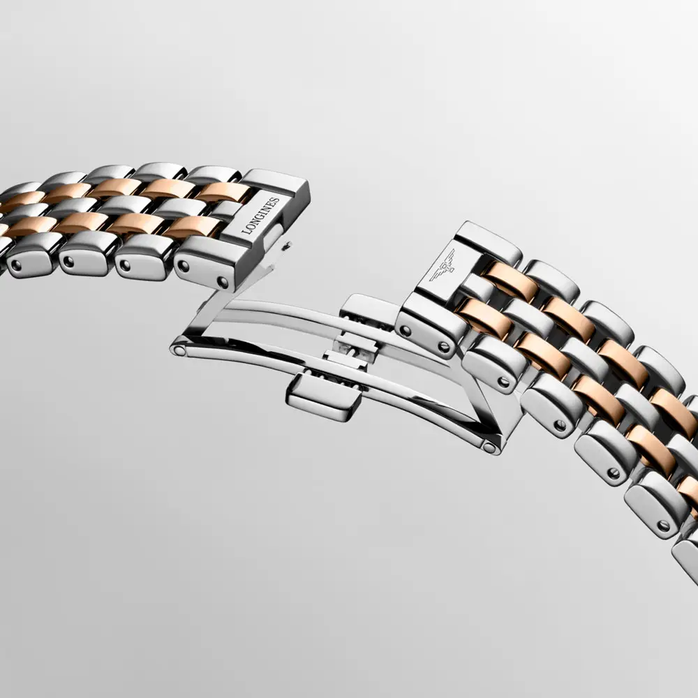 腕表搭载L178 石英机芯,确保精准可靠。精钢与玫瑰金间金表链搭配安全折叠表扣,提升整体质感,防水性能达3巴(30米),适合日常佩戴。