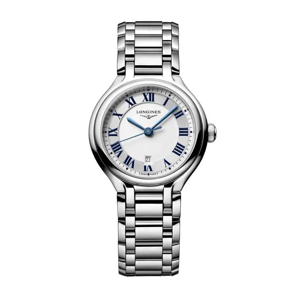 Longines PrimaLuna L8.142.4.71.6 属于 Longines 优雅系列,是一款灵感源自月亮柔美线条的女士腕表。30毫米不锈钢表壳纤薄精致,搭配双面防反射蓝宝石玻璃,清晰耐用。银色太阳纹表盘配罗马数字刻度,展现经典优雅。