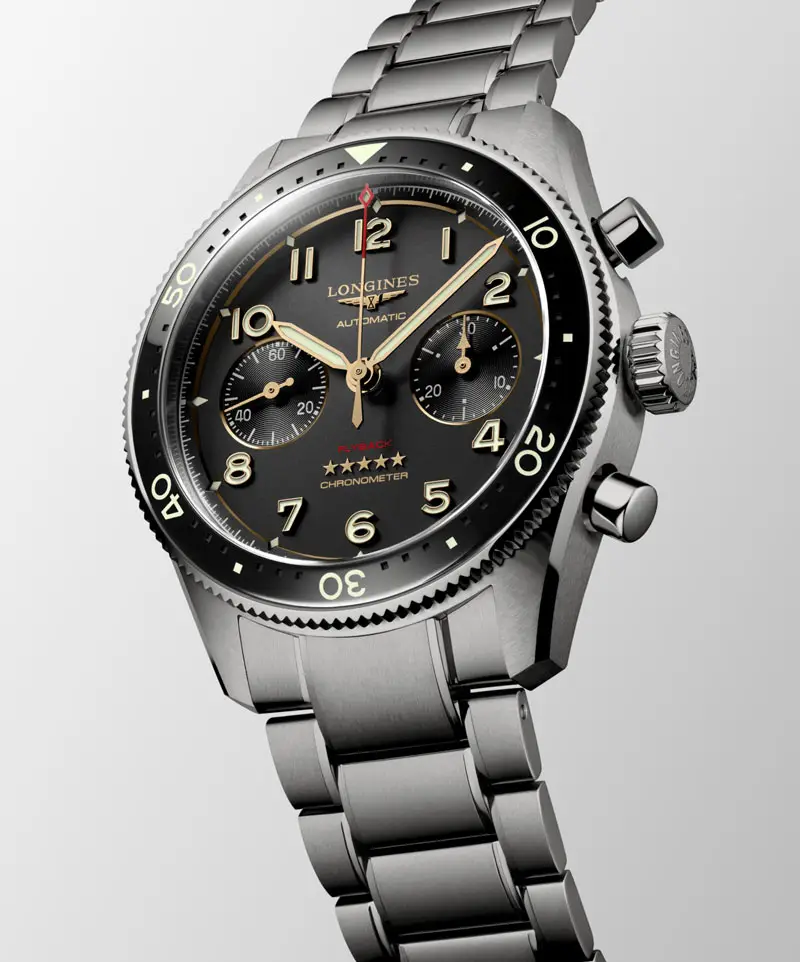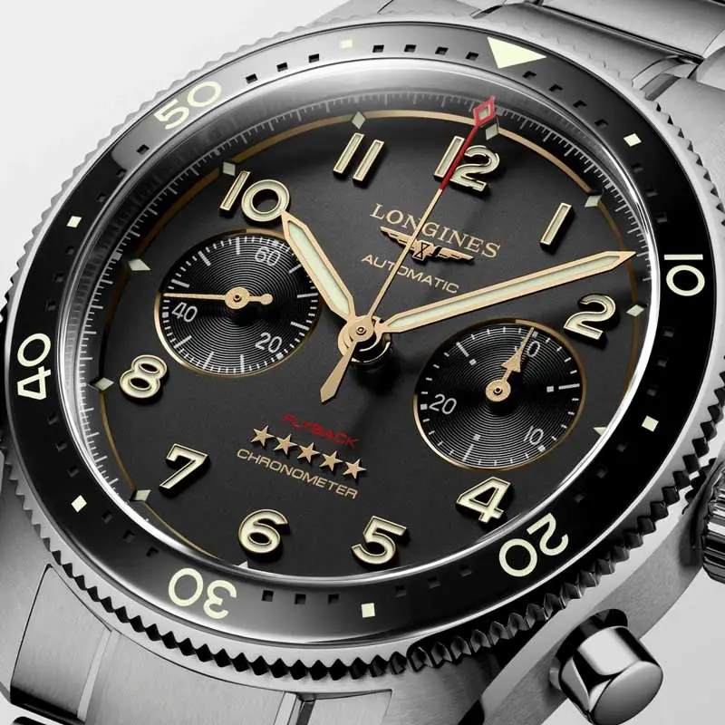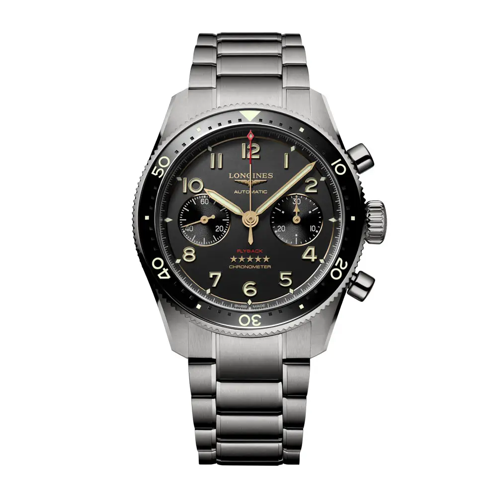 浪琴表 Spirit Flyback Titanium L3.821.1.53.6 将尖端科技与优雅耐用性完美结合。42 毫米钛金属表壳搭配陶瓷表圈,确保最佳的坚固性与佩戴舒适度。