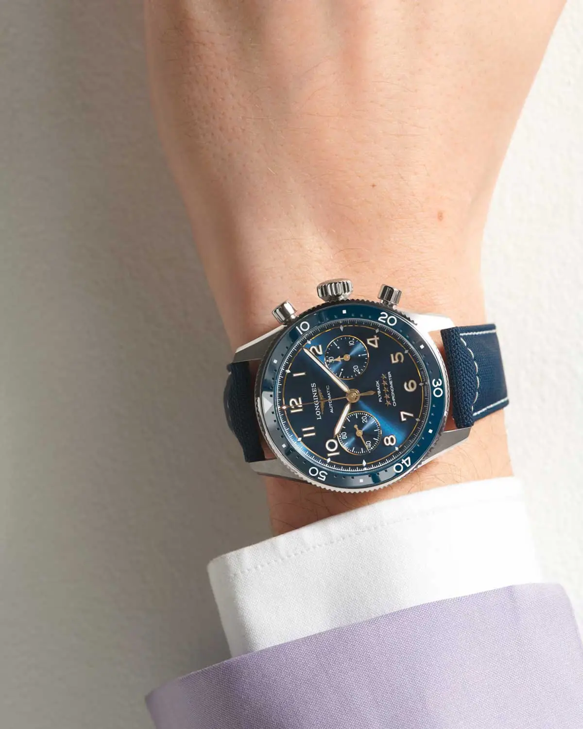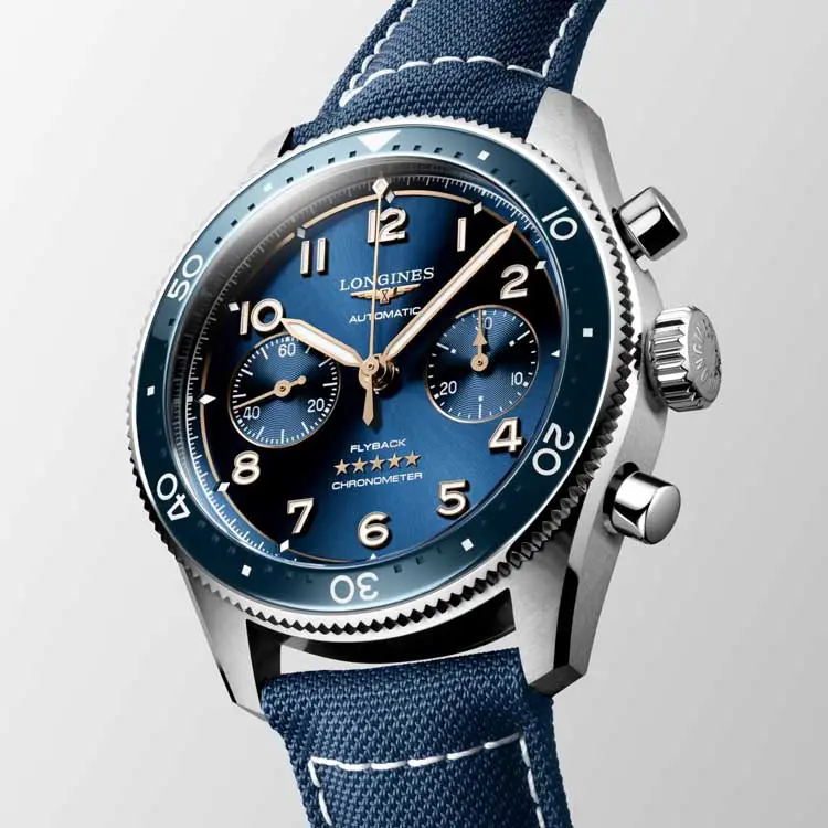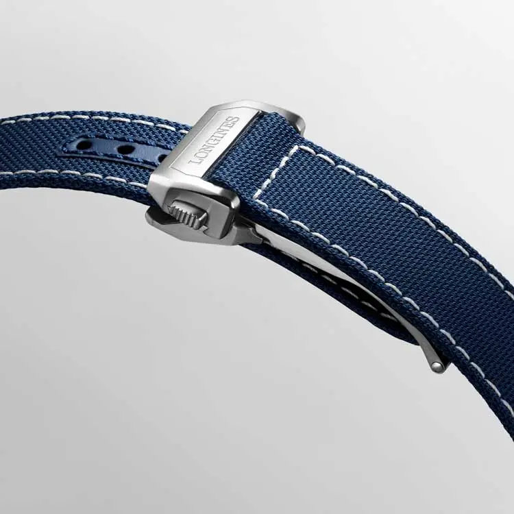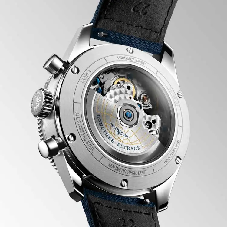 配备 10 ATM(100 米)防水性能 和 蓝色尼龙表带搭配折叠表扣,兼具舒适与耐用。Longines Spirit Flyback L3.821.4.93.2 是融合 历史传承、现代科技 与 瑞士制表工艺 的理想男士腕表。