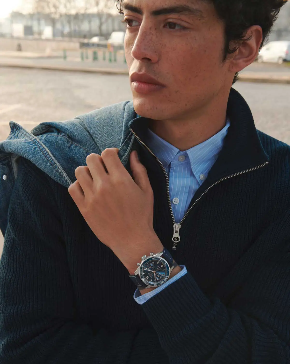 直径 42 毫米的圆形表壳 采用 不锈钢 制成,并配备一圈 耐刮陶瓷表圈,突显运动风格。蓝色表盘 配有醒目的时标、夜光指针 和 飞返计时功能,即使在极端环境下也能清晰读取时间。日期窗 设置在 4 点与 5 点之间,整体由 防反光蓝宝石玻璃 保护。