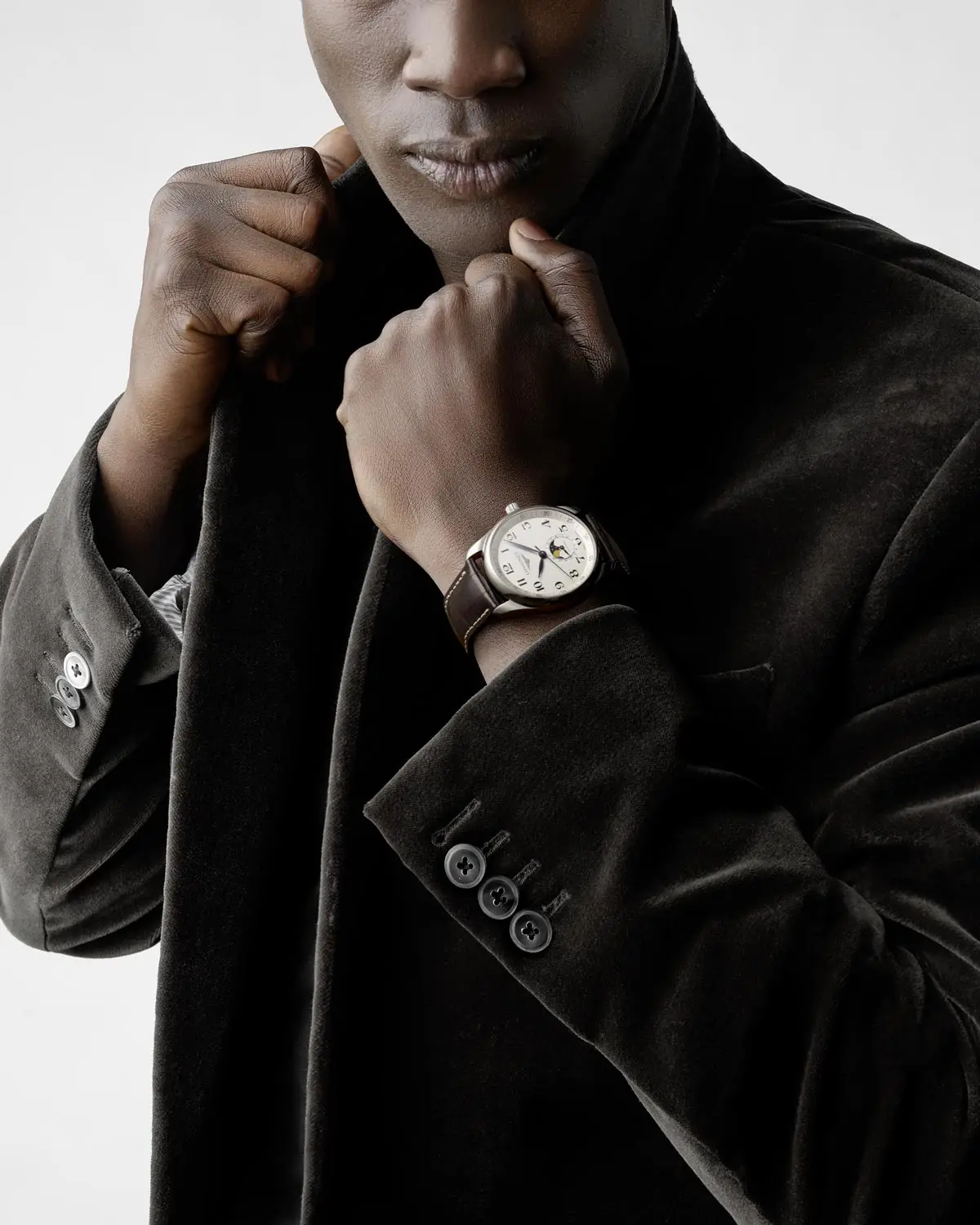 在 银色「barleycorn」表盘 上,阿拉伯数字与蓝钢指针形成和谐对比。6 点钟位置的副盘结合 月相显示与日期功能,为腕表增添实用性与层次感。