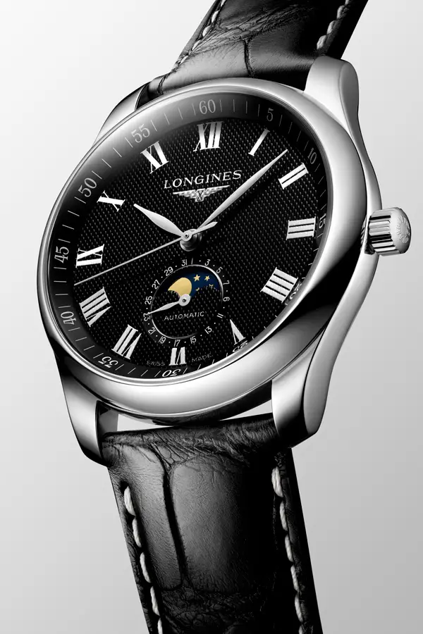 浪琴表 Longines Master Collection L2.909.4.51.7 是一款精致的自动腕表,配备 月相功能,融合瑞士制表传统与现代风格。40 毫米精钢表壳搭配防刮蓝宝石镜面,配黑色鳄鱼皮表带与三重安全折叠扣。