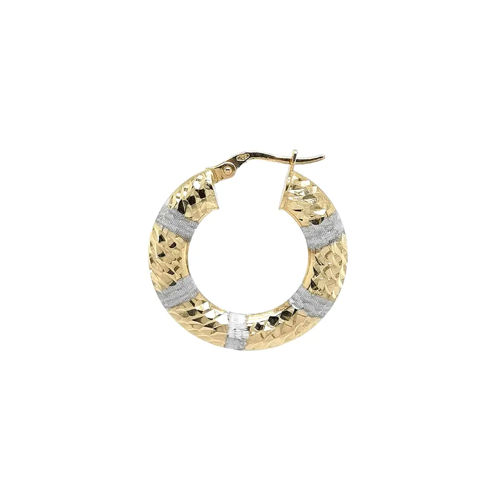 奢华双色黄金圈形耳环 以简洁而经典的设计脱颖而出,巧妙融合 黄金与白金色调,呈现出和谐而高雅的视觉效果。两种贵金属色彩的对比赋予耳环精致格调,轻松搭配各类黄金饰品。