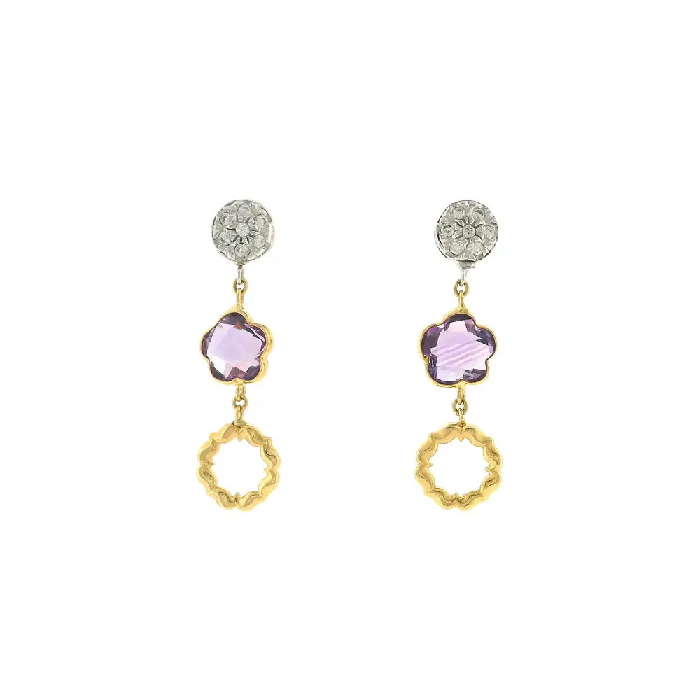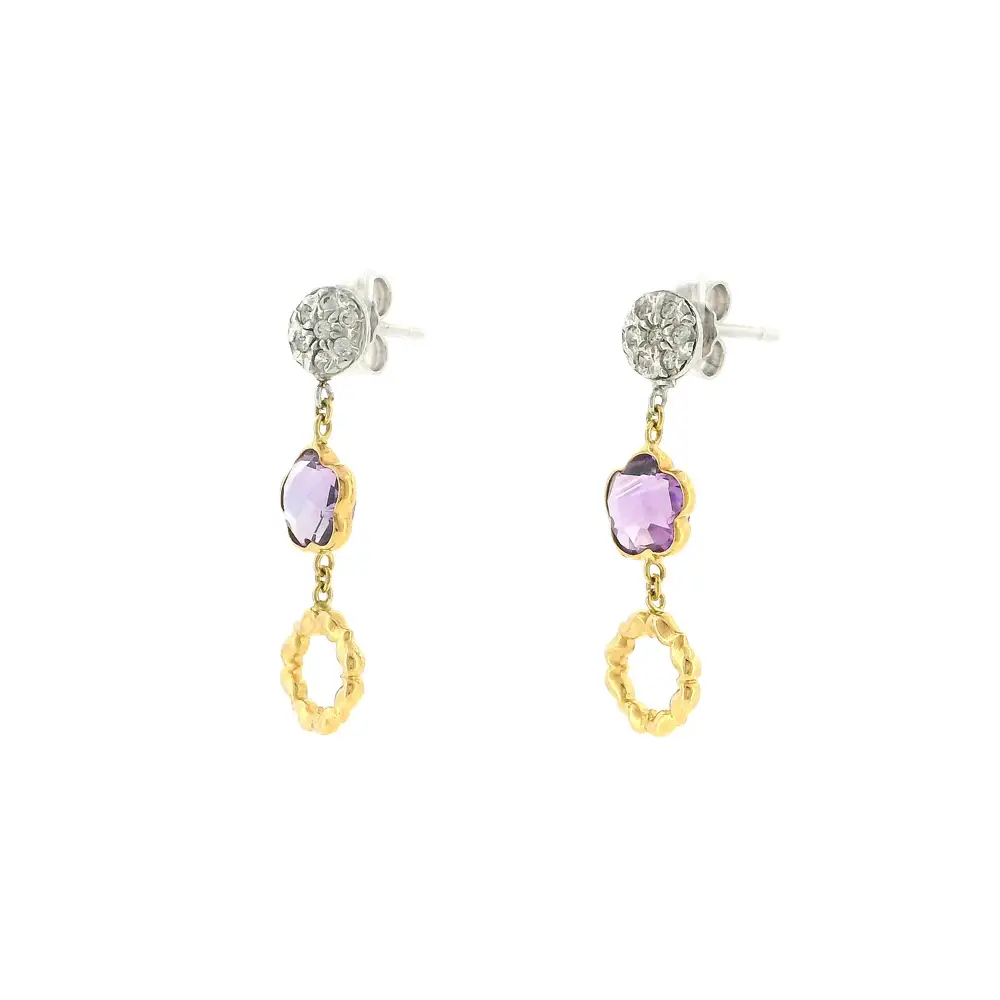 这款优雅黄金耳环,配紫水晶与精致锆石,以奢华外观和精致设计吸引目光。紫水晶带来独特的色彩点缀,小巧锆石在每个动作中闪耀迷人光彩。