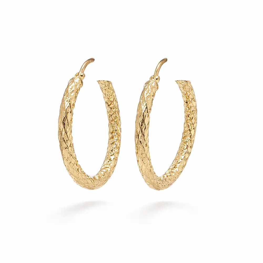 奢华黄金圈形耳环,钻石切割表面以其精致的纹理脱颖而出,能够完美反射光线,呈现优雅闪耀的效果。精细的切割工艺凸显黄金的层次感,适合日常佩戴及正式场合。