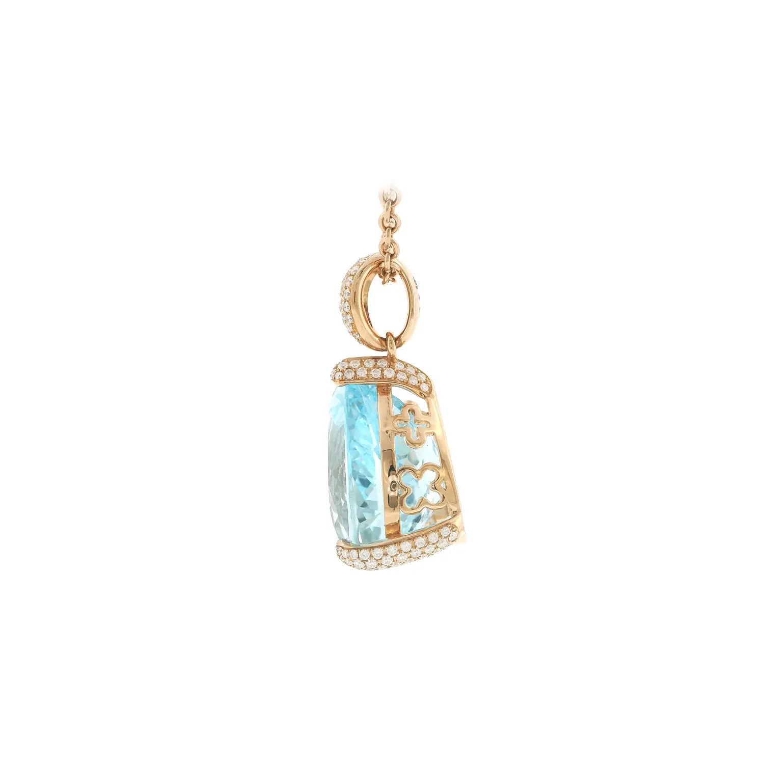 这款 玫瑰金镶蓝色托帕石与钻石奢华项链 充分展现优雅与尊贵气质。主石为 52.66 克拉蓝色托帕石,以其出色的净度、璀璨光泽及迷人的光影效果,赋予珠宝非凡魅力。