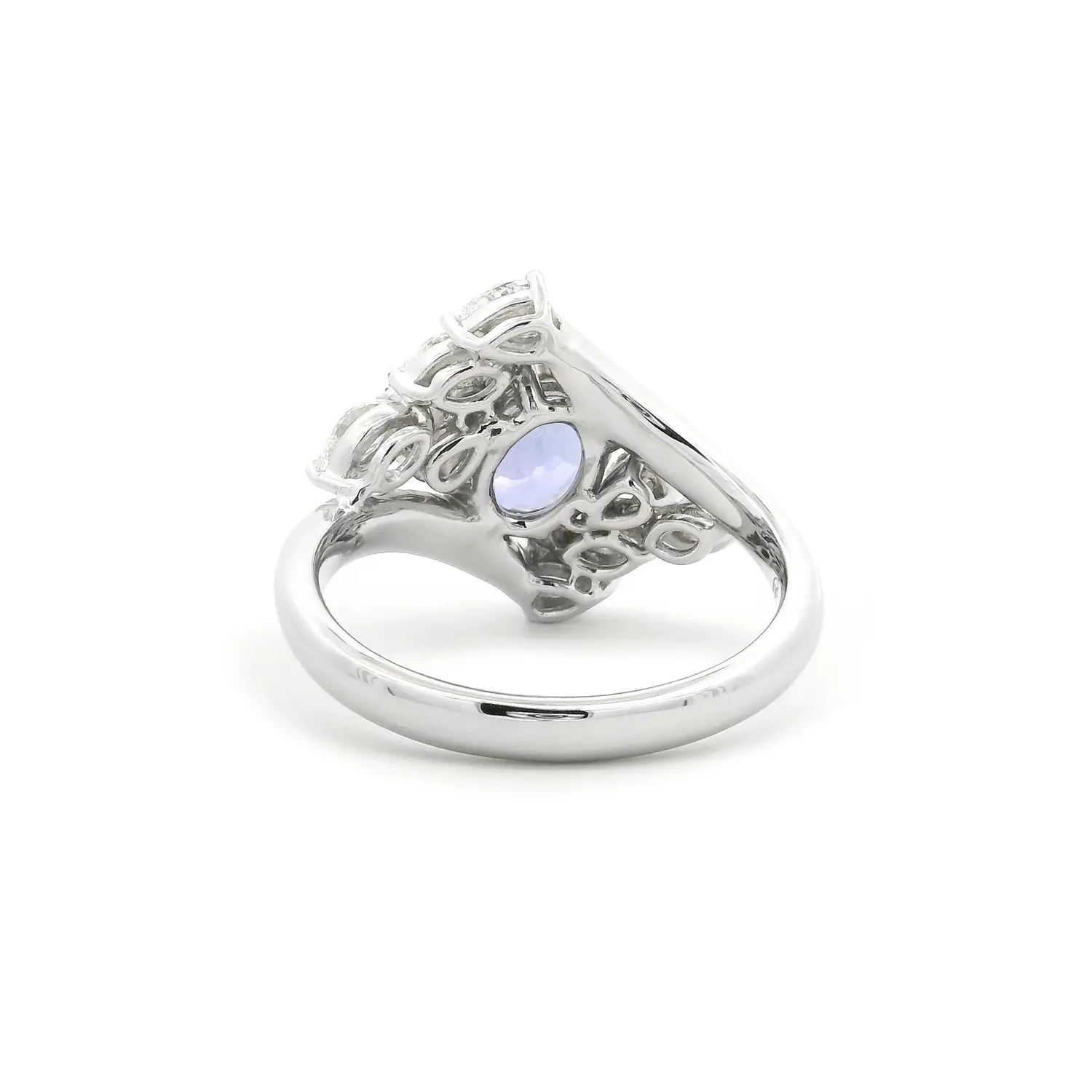 这款白金坦桑石钻石戒指以艺术感设计与精湛工艺令人惊艳。中央镶嵌一颗椭圆形切割坦桑石,呈现出迷人的蓝紫色光泽,会随光线变化而闪耀不同色调。坦桑石仅产于乞力马扎罗山脚下,象征着灵性力量、直觉与蜕变。