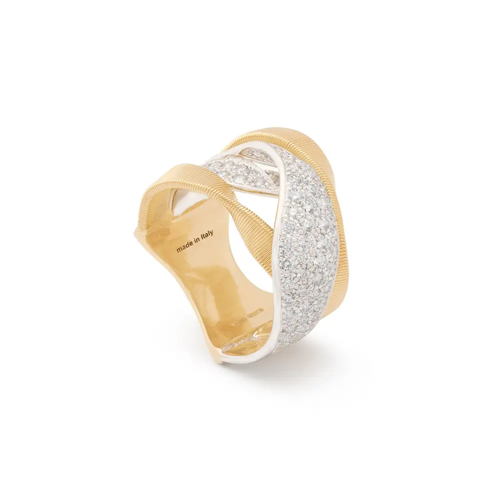 Marco Bicego Marrakech AG333-B1 YW M5 是一款来自标志性 Marrakech 系列的奢华女戒,以其独特的手工制作工艺闻名。戒指采用 18K 黄金沙与白金精制而成,独特的螺旋形线条由意大利工匠纯手工打造,灵感源自沙漠中优美的沙丘曲线。