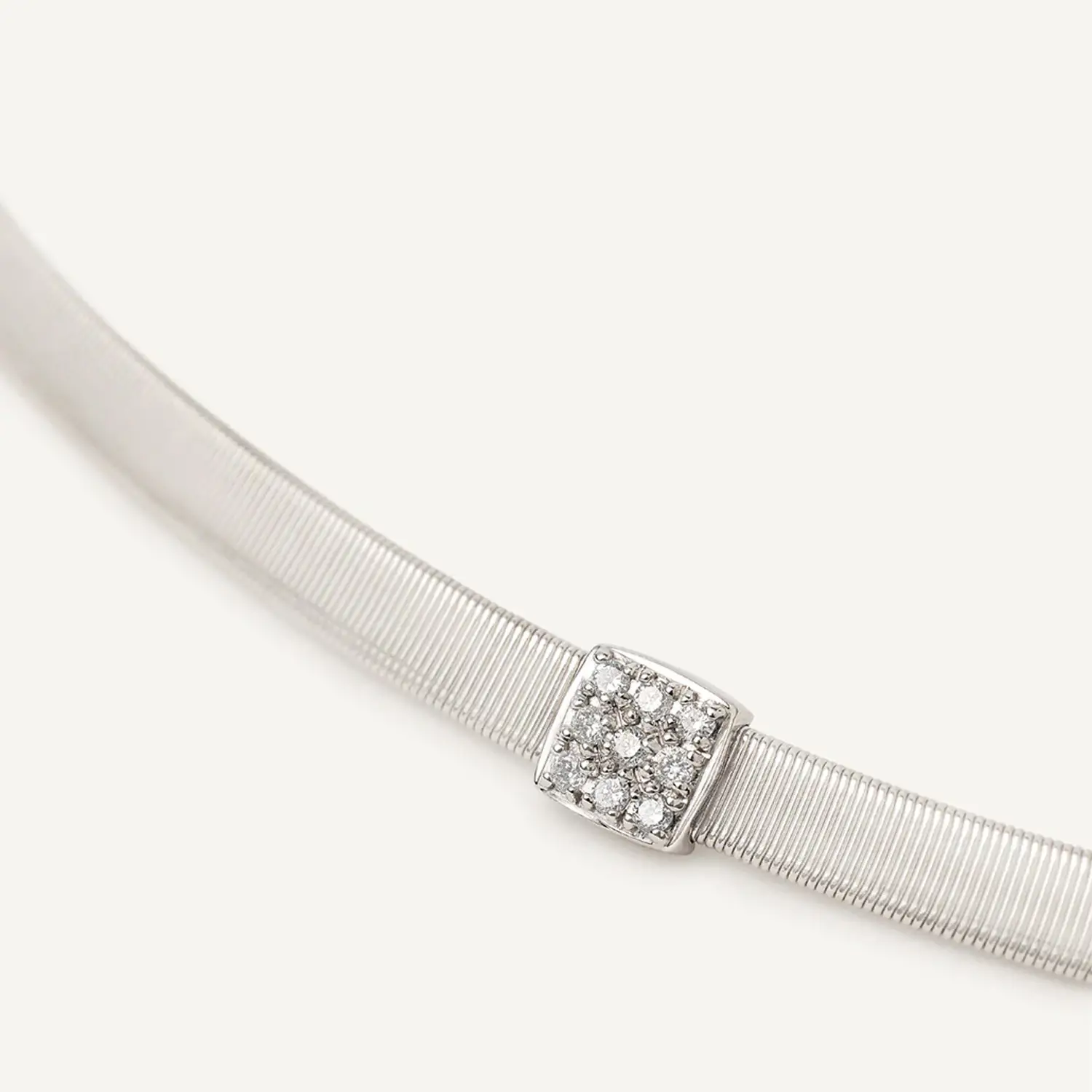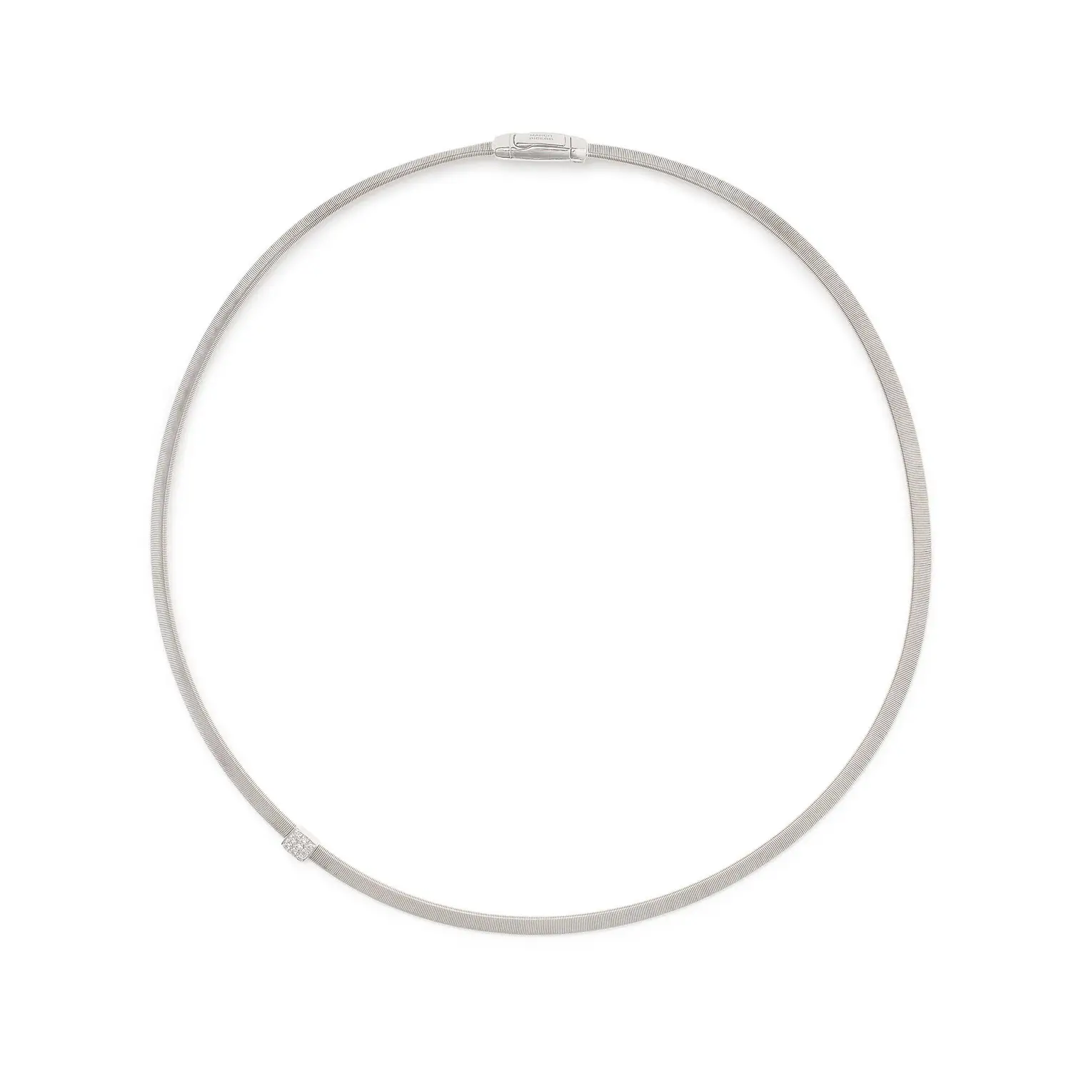 这款来自 Masai 系列的项链,展现了 现代极简主义与意式优雅 的完美结合。采用 18 K 白金 精制,并镶嵌 总重约 0.07 克拉的钻石微镶(Pavé),在简约中蕴含奢华。设计灵感源自非洲马赛族文化,以纯净的线条展现力量与和谐之美。