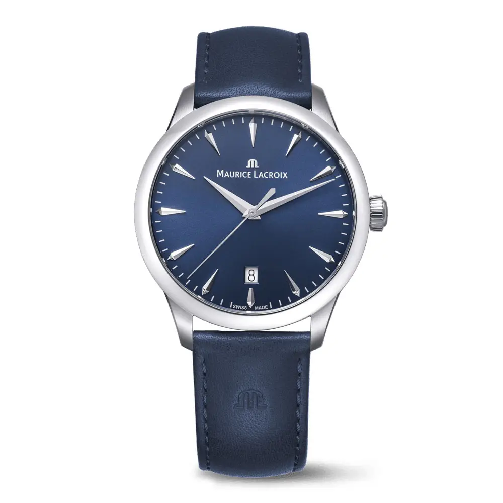Maurice Lacroix 1975 Quartz 39 毫米(型号 751007‑SS001‑430‑4) 将永恒优雅与运动风格以及现代可靠性完美结合。设计灵感源于 1970 年代,是日常佩戴的时尚腕表。直径 39 毫米的圆形不锈钢表壳 佩戴舒适,抗刮蓝宝石镜面 保护深邃 蓝色模拟表盘,具有出色的读时效果。3 点钟位置的日期显示 提供实用功能。