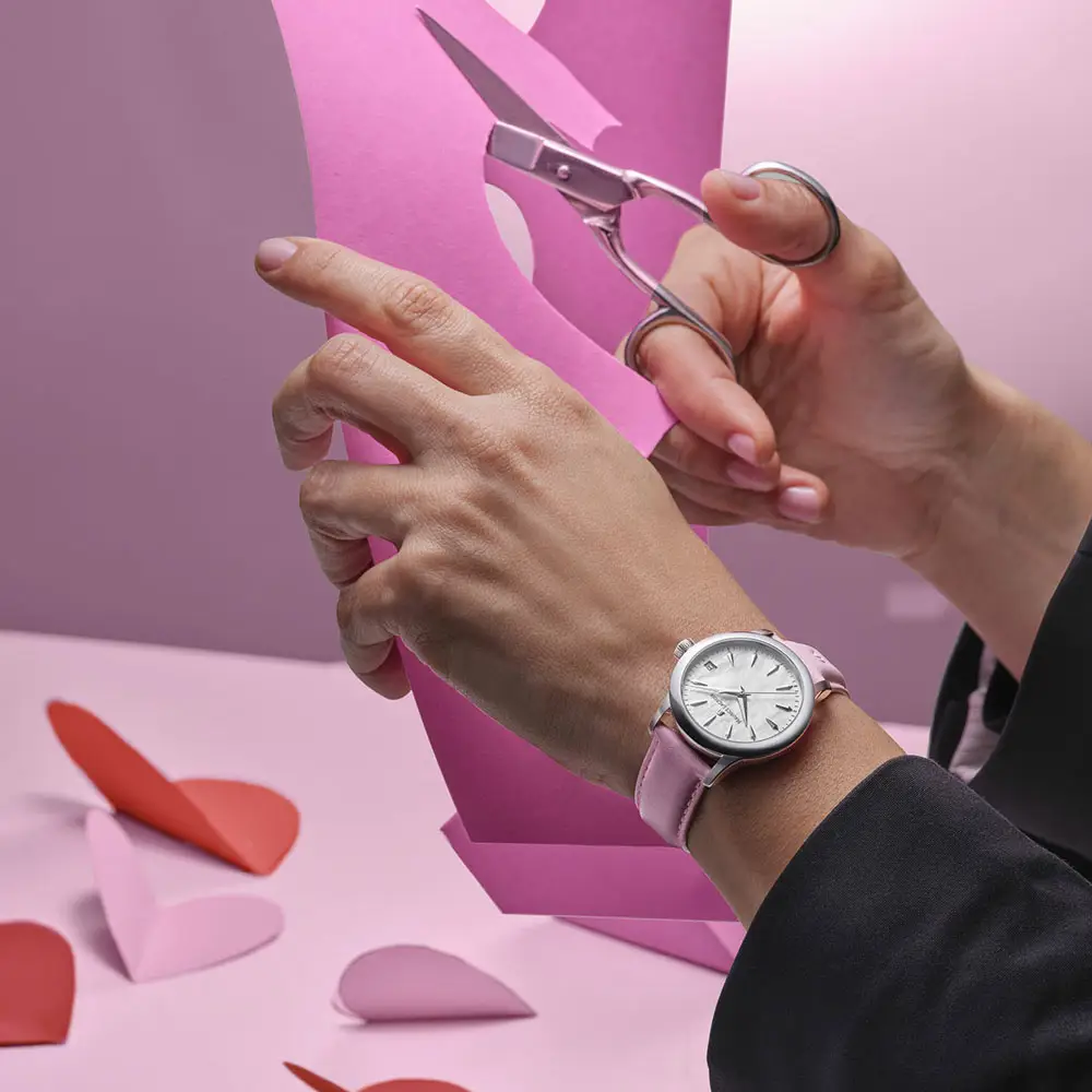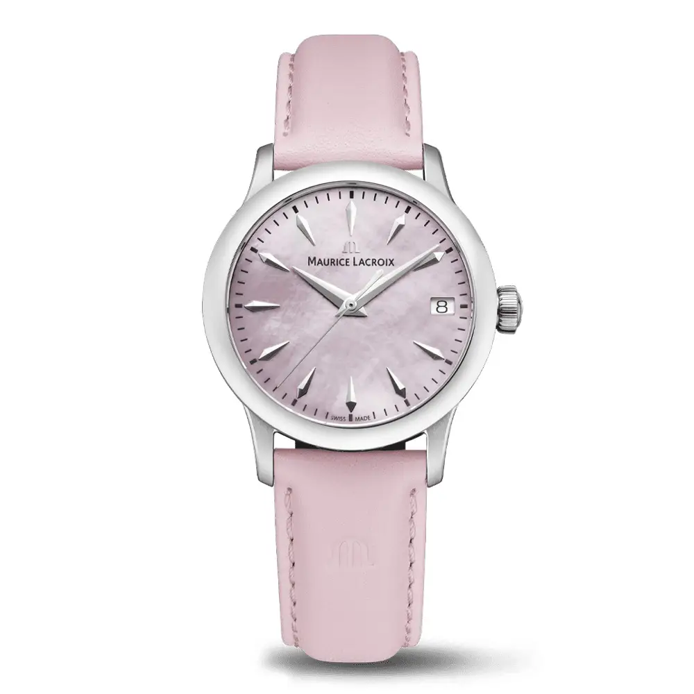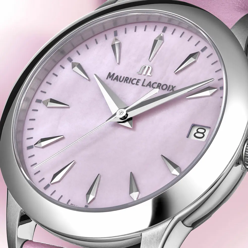 腕表搭配 粉色皮革表带和针扣,并配备便捷的快速更换系统。凭借 100 米防水性能,适合日常佩戴以及偶尔接触水的情况。Maurice Lacroix 1975 系列 完美结合优雅风格、瑞士品质与经典设计。