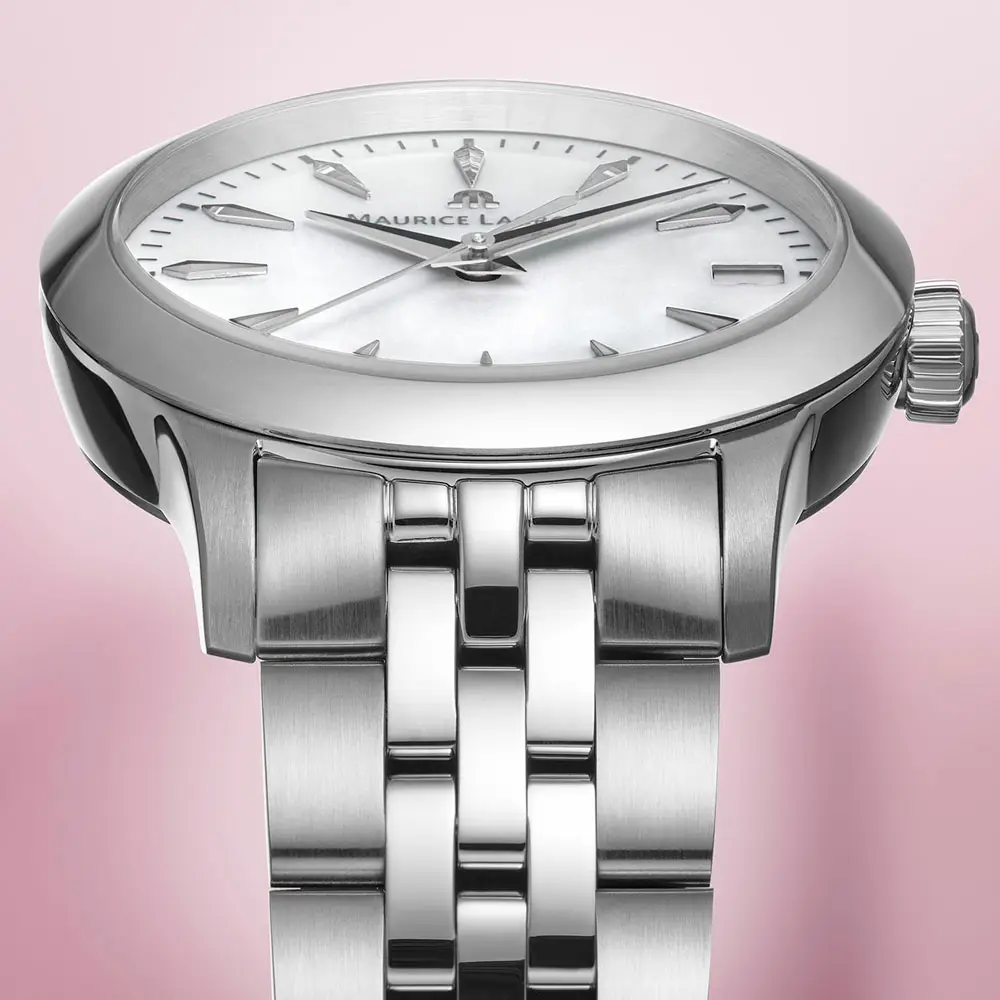 腕表搭配 不锈钢表链、蝴蝶扣以及快速更换系统,佩戴舒适稳固。凭借 100 米(10 ATM)防水性能,适合日常佩戴以及偶尔接触水的情况。Maurice Lacroix 1975 系列 完美融合优雅风格、瑞士品质与经典设计。