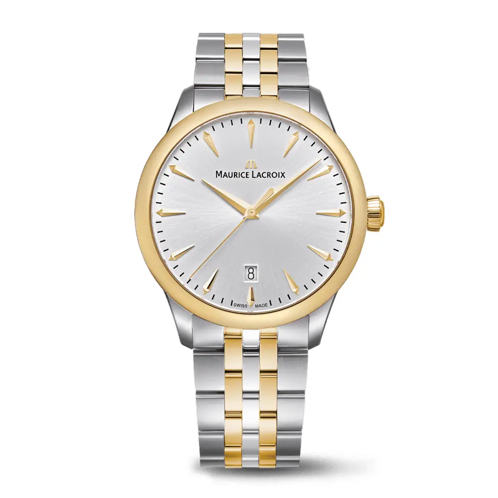 Maurice Lacroix 1975 Quartz Duotone 39mm (751007-PVY12-130-1) 融合经典设计与瑞士制表精准。其 39 毫米精钢表壳,厚度 8.6 毫米,搭配 PVD 镀金,展现精美的双色外观。表盘由 防刮擦蓝宝石水晶镜面 保护,清晰持久。