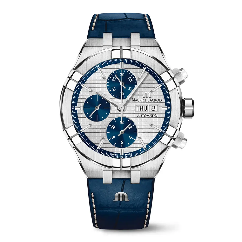 Maurice Lacroix Aikon Automatic Chronograph (ref. AI6038-SS001-131-1) 完美融合了 运动优雅、精湛工艺与瑞士精准制表技术。其 44 毫米精钢表壳 结合抛光与拉丝工艺,呈现出 Aikon 系列特有的现代风格。