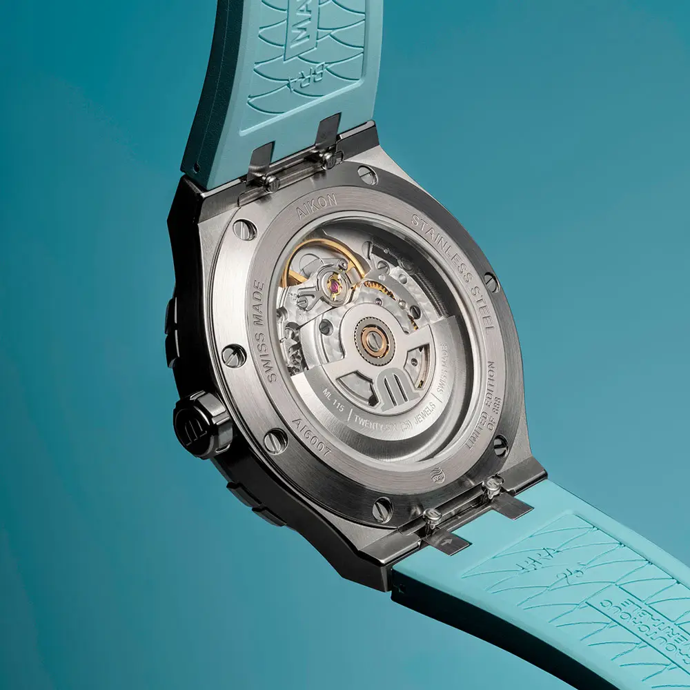 腕表搭载 瑞士自动机芯 ML115,提供 38 小时动力储存,走时精准流畅。具备 20 ATM (200 米) 防水性能,适合游泳与水上活动。一体式精钢表链搭配折叠表扣,成就和谐奢华的 Aikon Summer Edition 设计。