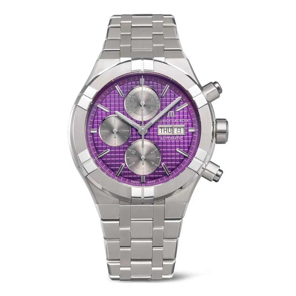 Maurice Lacroix Aikon Automatic Chronograph (ref. AI6038-TT032-430-1) 完美融合了 运动活力与优雅奢华。其 44 毫米钛金属表壳 轻盈坚固,拉丝与抛光表面相结合,展现出独特的现代机械美感。