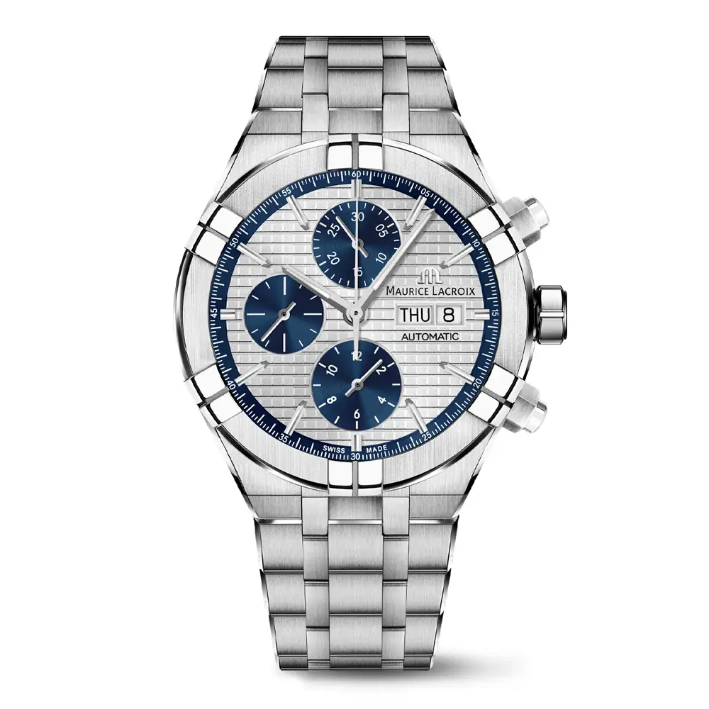 Maurice Lacroix Aikon Automatic Chronograph (ref. AI6038-SS002-131) 完美融合了 运动优雅、强劲性能与瑞士精准工艺。其 44 毫米精钢表壳 结合抛光与拉丝工艺,展现出现代且充满活力的 Aikon 系列特质。