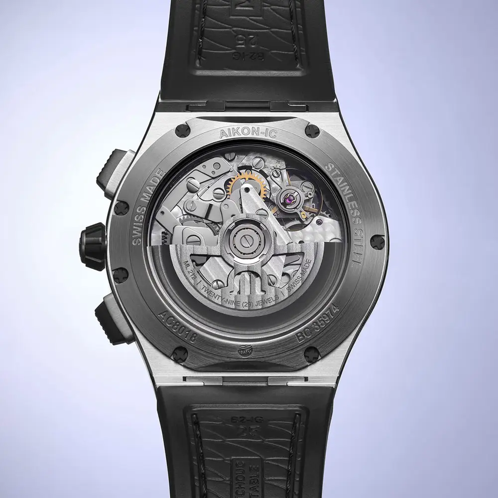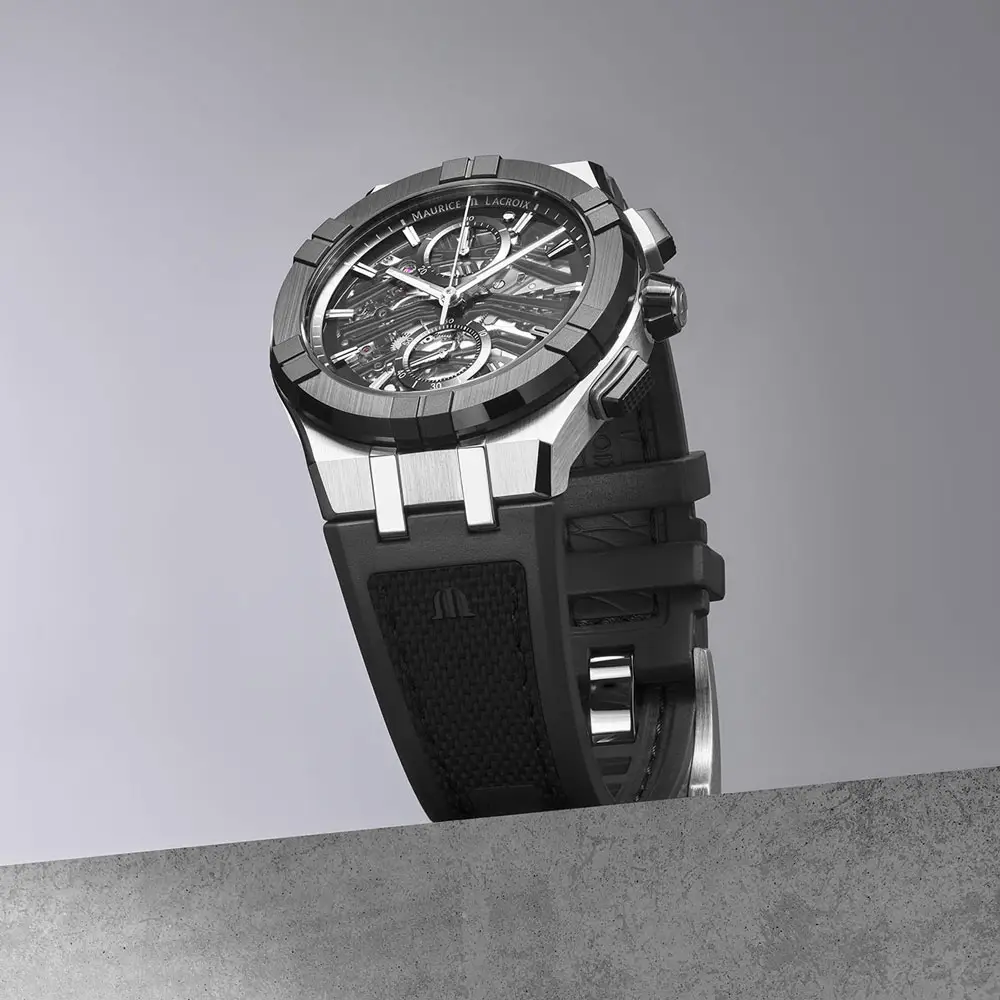 Maurice Lacroix AikonIc Automatic Chronograph Skeleton(型号 AC8018-SSL20-030-2)是一款现代运动计时腕表,采用大胆的镂空设计,突出机械结构之美。43毫米316L不锈钢表壳搭配陶瓷表圈,具备优异的耐刮性能。标志性的六臂表圈设计极具辨识度。配备双面防反射蓝宝石玻璃、旋入式表冠,防水性能达 100米(10 ATM)。