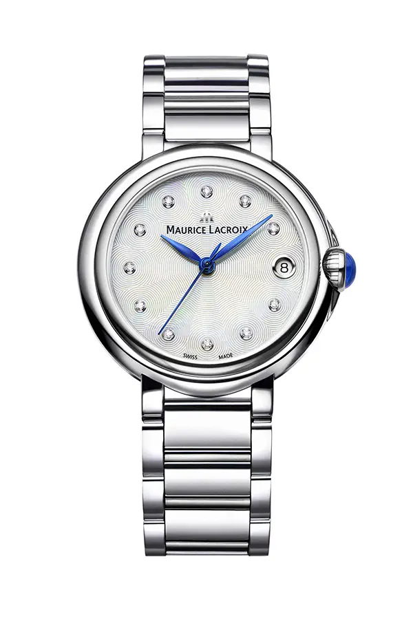 莫里斯-拉克鲁瓦 (Maurice Lacroix) 的 Fiaba 系列女表,简约而不失精致,彰显女性魅力。珍珠贝母表盘镶嵌 11 颗钻石,而非数字。12 个数字与位于第三个小时位置的日期显示相得益彰。腕表采用独特的亮蓝色指针,与抛光精钢表带形成鲜明对比。