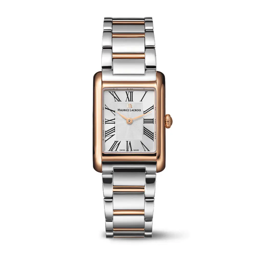 莫里斯-拉克鲁瓦(Maurice Lacroix)Fiaba Square FA1205-PVP02-110-A是一款优雅的女装腕表,融合了精细的线条、瑞士的精准度和精致的双色设计。24×34 毫米的长方形表壳由抛光钢制成,并经过玫瑰金 PVD 涂层处理,尽显奢华气质。表壳高度仅为6.5 毫米,显得极为精致。