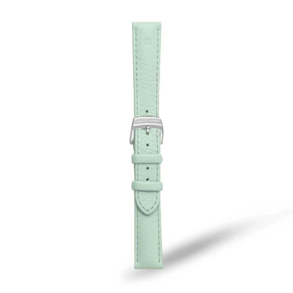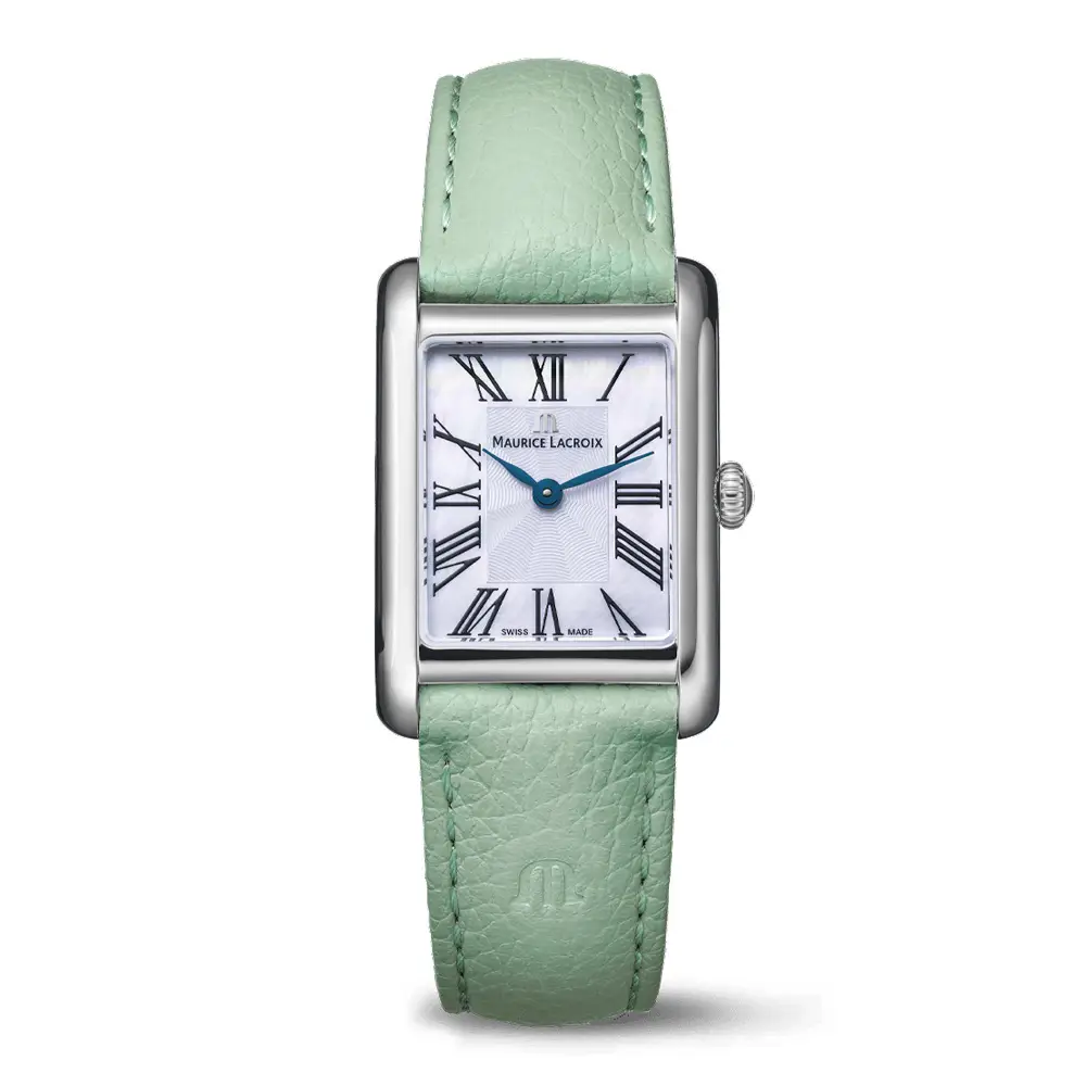 浅绿色皮革表带配针扣 并支持快速更换。具备 50米防水(5 ATM),适合日常佩戴。适合追求 高端瑞士女士腕表 的女性。