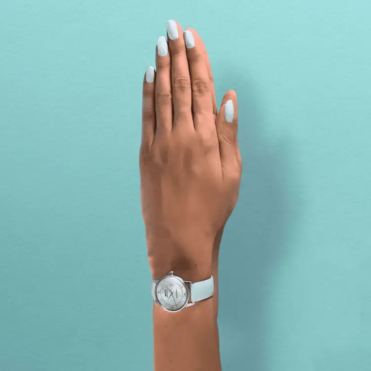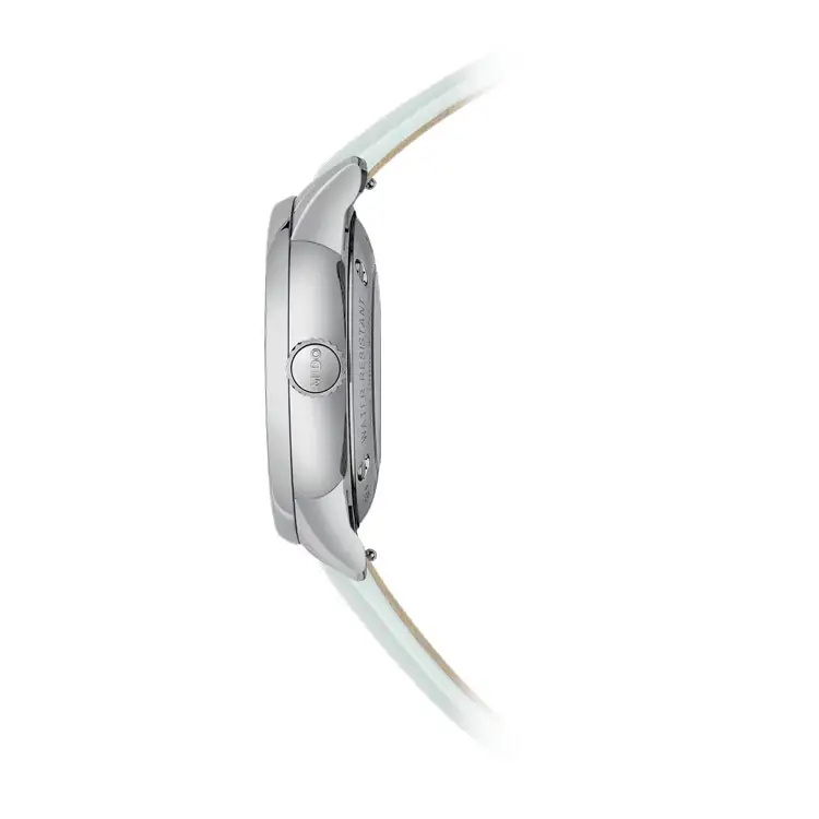 这款型号的独特魅力还体现在 优雅的松石色皮革表带搭配经典针扣,佩戴安全舒适。腕表 防水等级5 ATM(50米),适合偶尔接触水时佩戴。