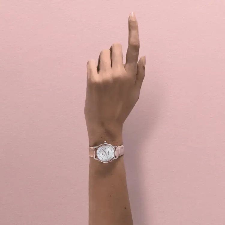 迷人的 珍珠母贝表盘镶嵌精美钻石,并配有实用的 日期显示,兼具美感与日常佩戴的实用性。