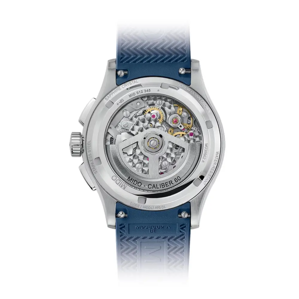 内部搭载 可靠的 Mido Automatic ETA 机械自动上链机芯,动力储存约60小时,确保长时间稳定与精准运行。