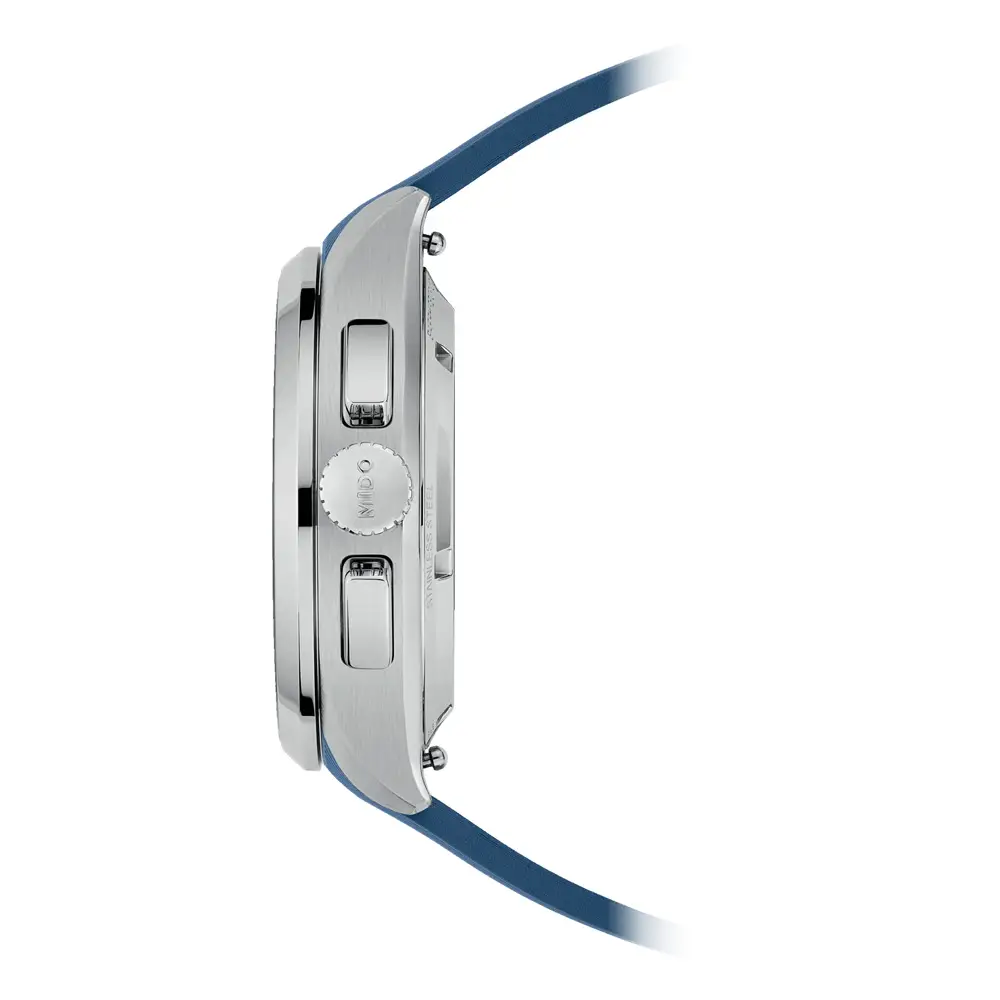腕表配备 舒适的蓝色橡胶表带搭配经典针扣,佩戴安全且舒适。腕表 防水等级10 ATM(100米),不仅适合日常佩戴,还可用于包括游泳在内的运动活动。