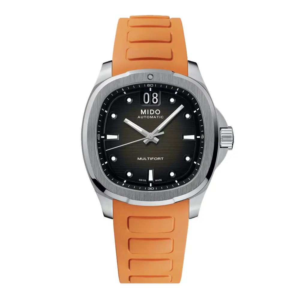 Mido Multifort TV Big Date M049.526.17.081.00 将 1970 年代的经典方形设计以现代方式重现。39.2 × 40 毫米精钢表壳 搭配 双面防眩光蓝宝石水晶镜面,展现细腻质感。灰色渐变表盘 上的 大型日期窗位于 12 点位置,兼具实用性与视觉平衡。
