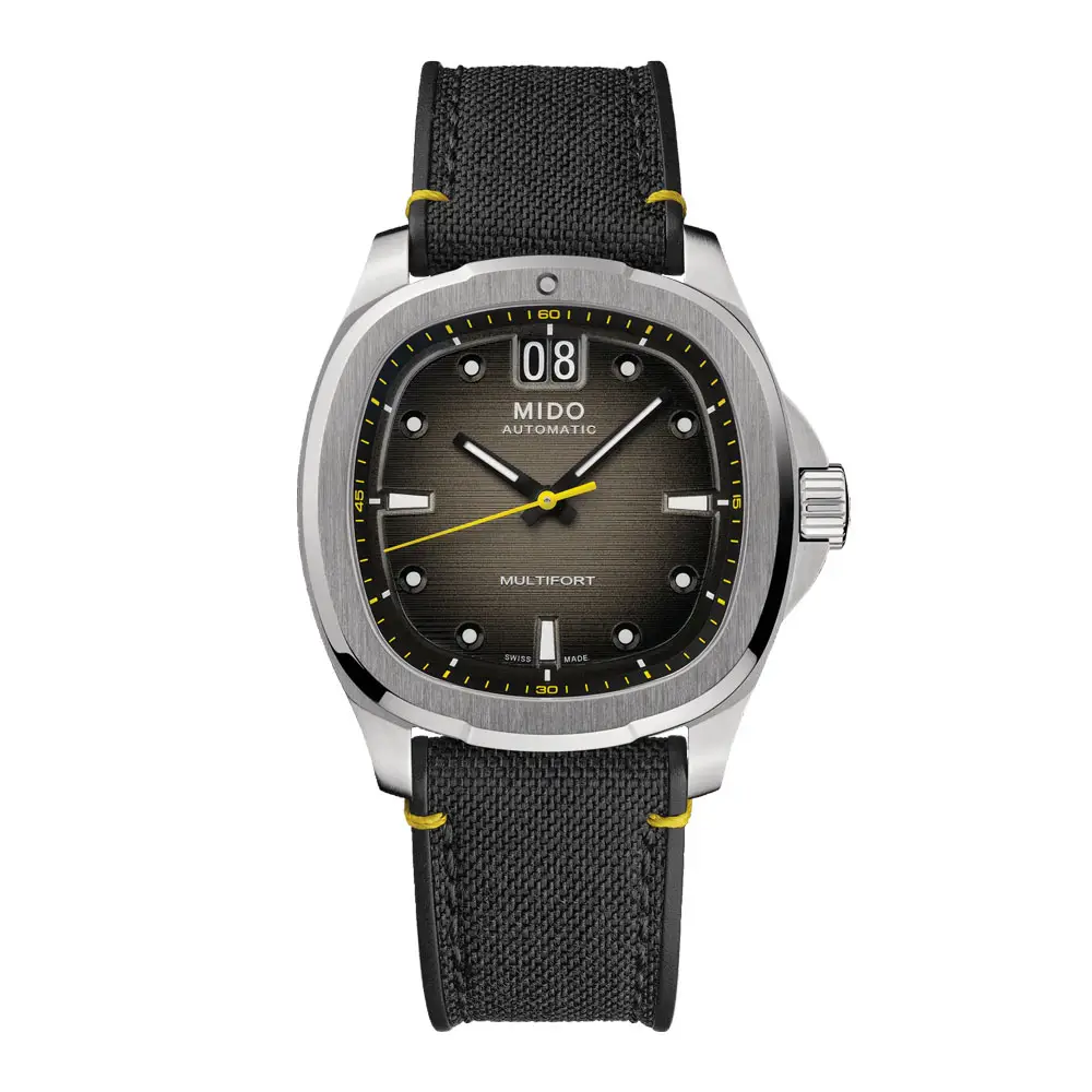 Mido Multifort TV Big Date M049.526.17.081.01 在现代演绎中复兴了 1970 年代大胆的 “TV” 风格。其 不锈钢电视形状表壳(40 × 39.2 mm) 配备 双面防反射蓝宝石玻璃。在 灰色渐变表盘 上,12 点位置的大日期窗 提供卓越可读性。