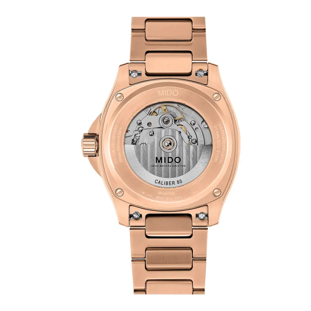 腕表搭载可靠的 Mido Caliber 80 自动机芯,提供长达 80 小时动力储存。Nivachron 游丝提升抗磁及抗冲击性能。腕表的一大亮点是位于 12 点位置的大日历显示(Big Date),读时更加直观。透明底盖可欣赏机芯运作。