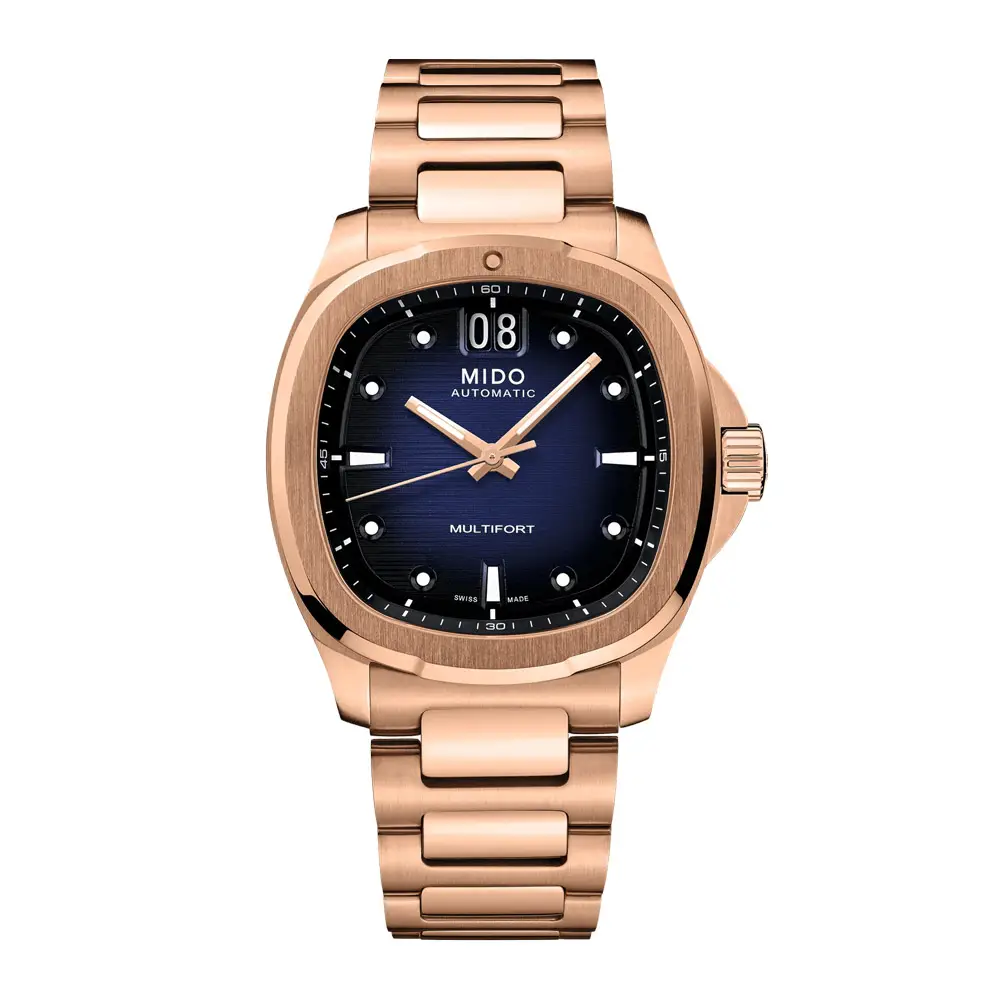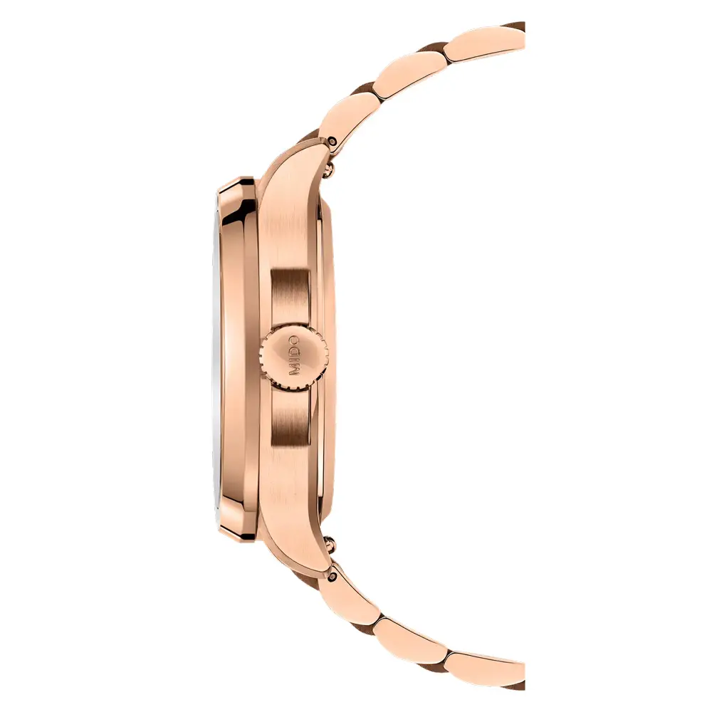 Mido Multifort TV Big Date M049.526.33.041.00 以独特的复古设计脱颖而出,灵感来自 20 世纪 70 年代的电视屏幕。标志性的 TV 造型表壳(40 × 39.2 毫米)采用316L 不锈钢并覆玫瑰金 PVD 涂层,呈现大胆现代外观。**防刮蓝宝石玻璃(双面防反射涂层)**确保清晰读时,同时具备 100 米防水性能(10 bar),适合日常佩戴。