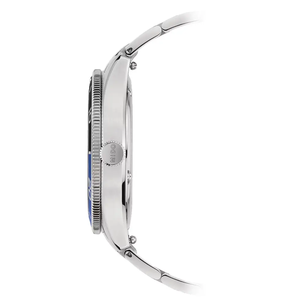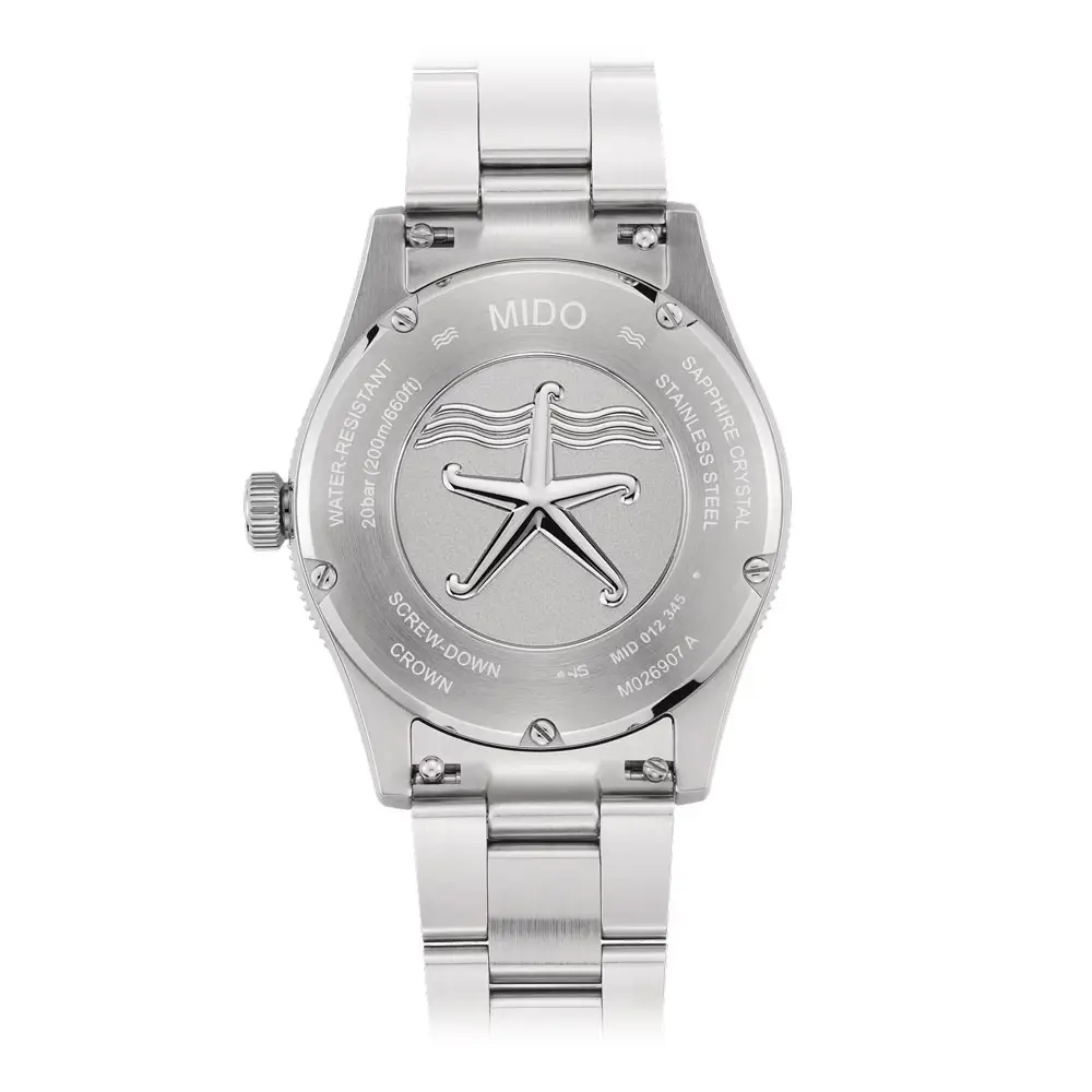 该表款搭载创新的72 型自动机芯(ETA 研发 A31.111),动力储备长达 72 小时,配备Nivachron™ 防磁游丝,确保长期精准可靠。防水深度达 200 米,旋入式表冠和星形浮雕底盖体现了美度在潜水表领域的传统和专长。