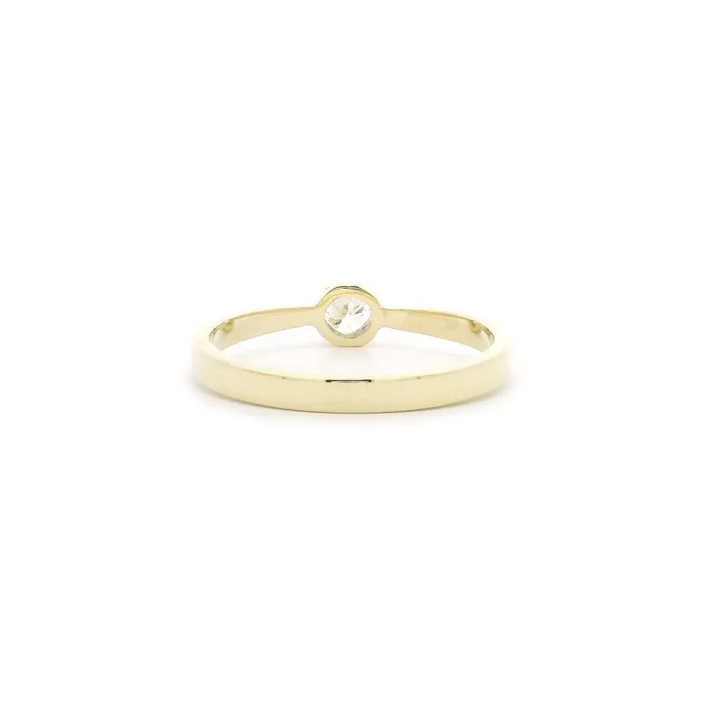 这枚 极简风格黄金钻石订婚戒指 体现了优雅与纯净。简洁的线条衬托出中央宝石 —— 一颗 0.18 克拉钻石,G 色、VS 净度,在每一个动作中闪耀光芒。