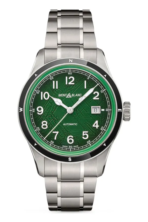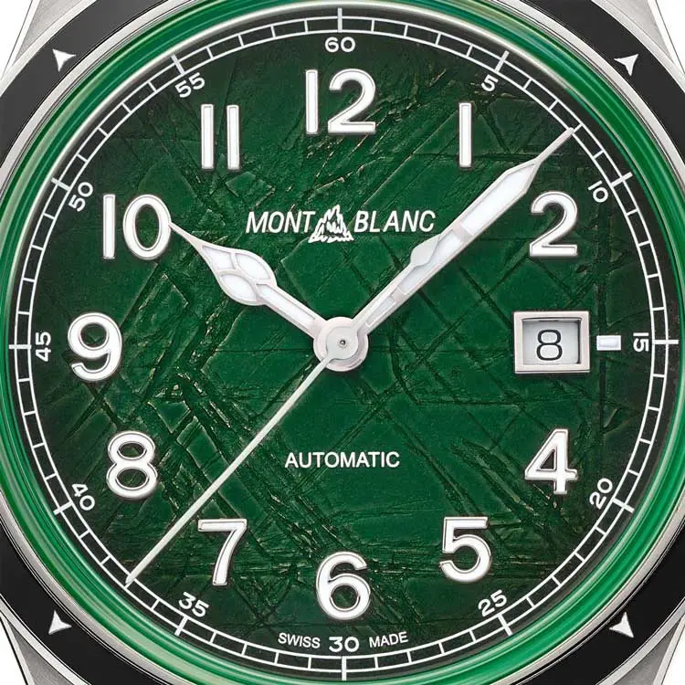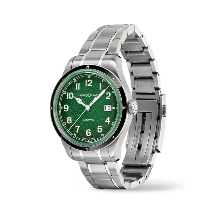 Montblanc 1858 Automatic Date 0 Oxygen 133269 将技术精准与冒险精神完美融合。41毫米圆形不锈钢表壳 搭配 坚固的陶瓷表圈 与 蓝宝石水晶镜面,即使在恶劣环境下也能保持清晰读时。醒目的绿色表盘 呈现自然景致,3点钟位置设有 实用的日期显示窗。