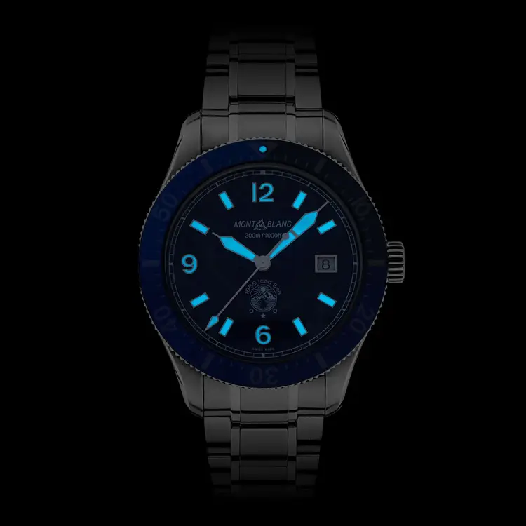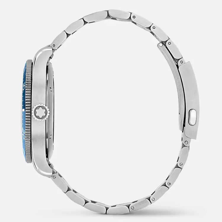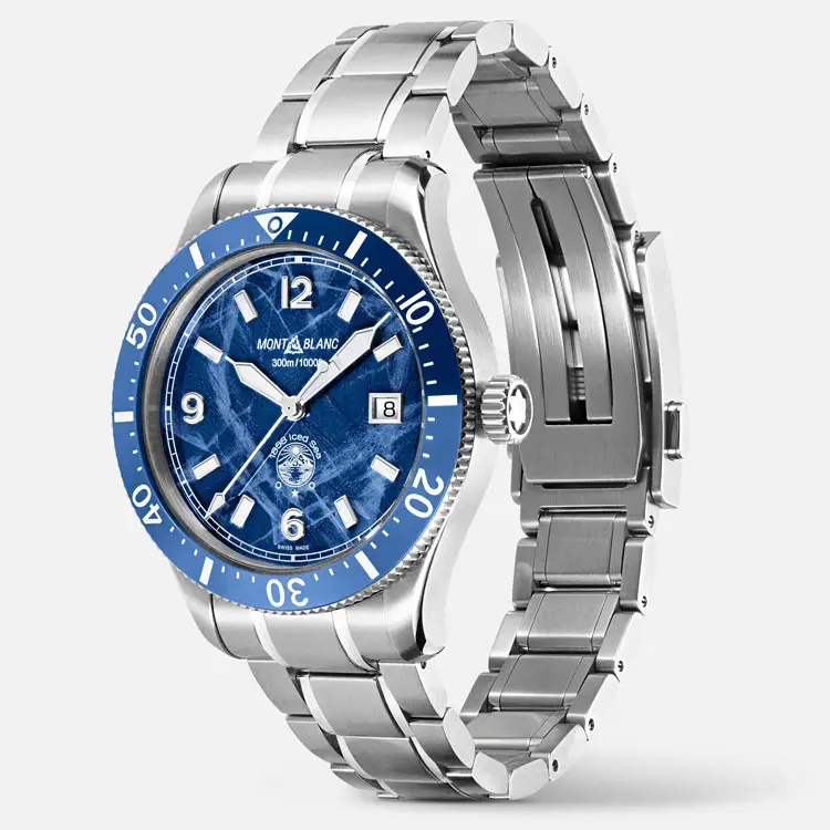 这款腕表为真正的探险者而设计,具备300 米(30 ATM)防水性能,足以应对各种严苛的潜水任务。银色不锈钢表链配备折叠式表扣,无论是下水还是穿梭于都市丛林中,都能带来舒适与安全。蓝色版本的 Montblanc 1858 Iced Sea 代表了性能、风格与原创性的完美融合。